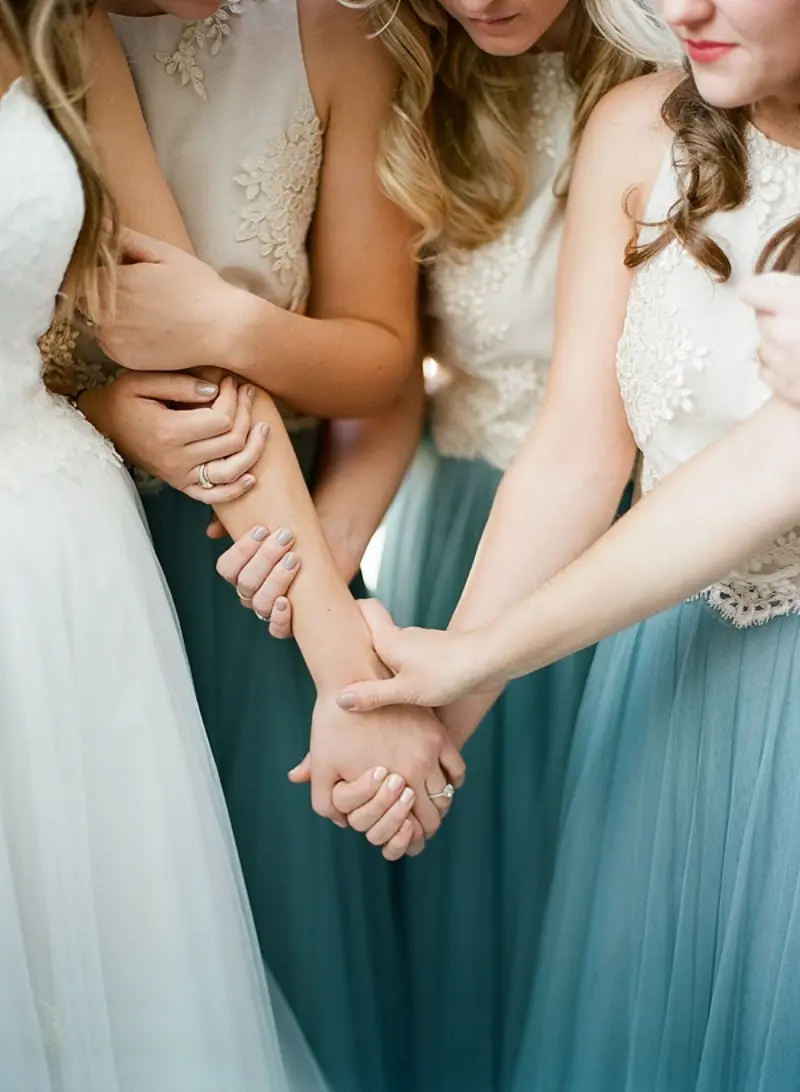 madrinhas de casamento orando com a noiva