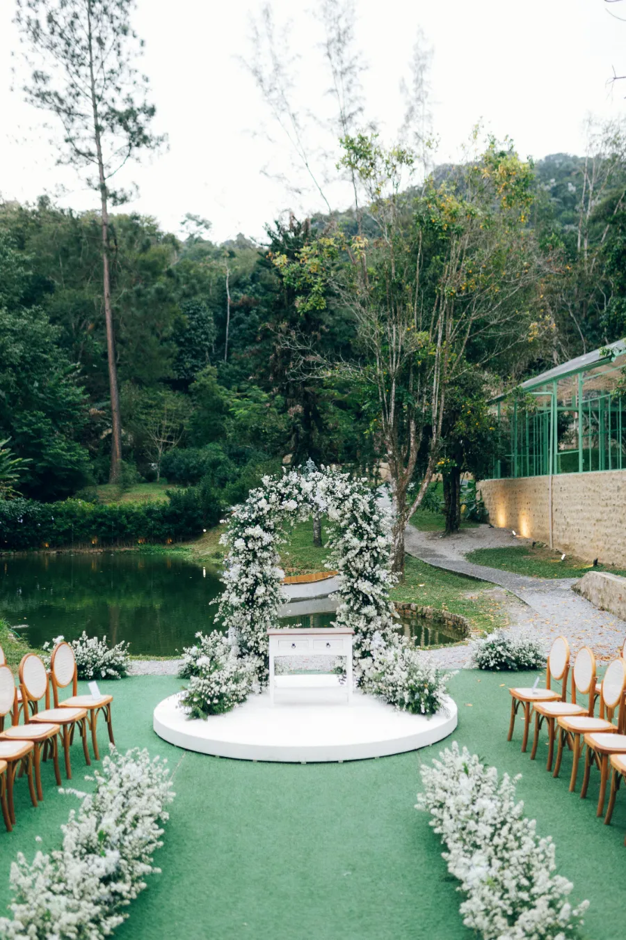 A decoração foi pensada na paleta verde e branco, com detalhes de azul, principalmente no look das madrinhas.