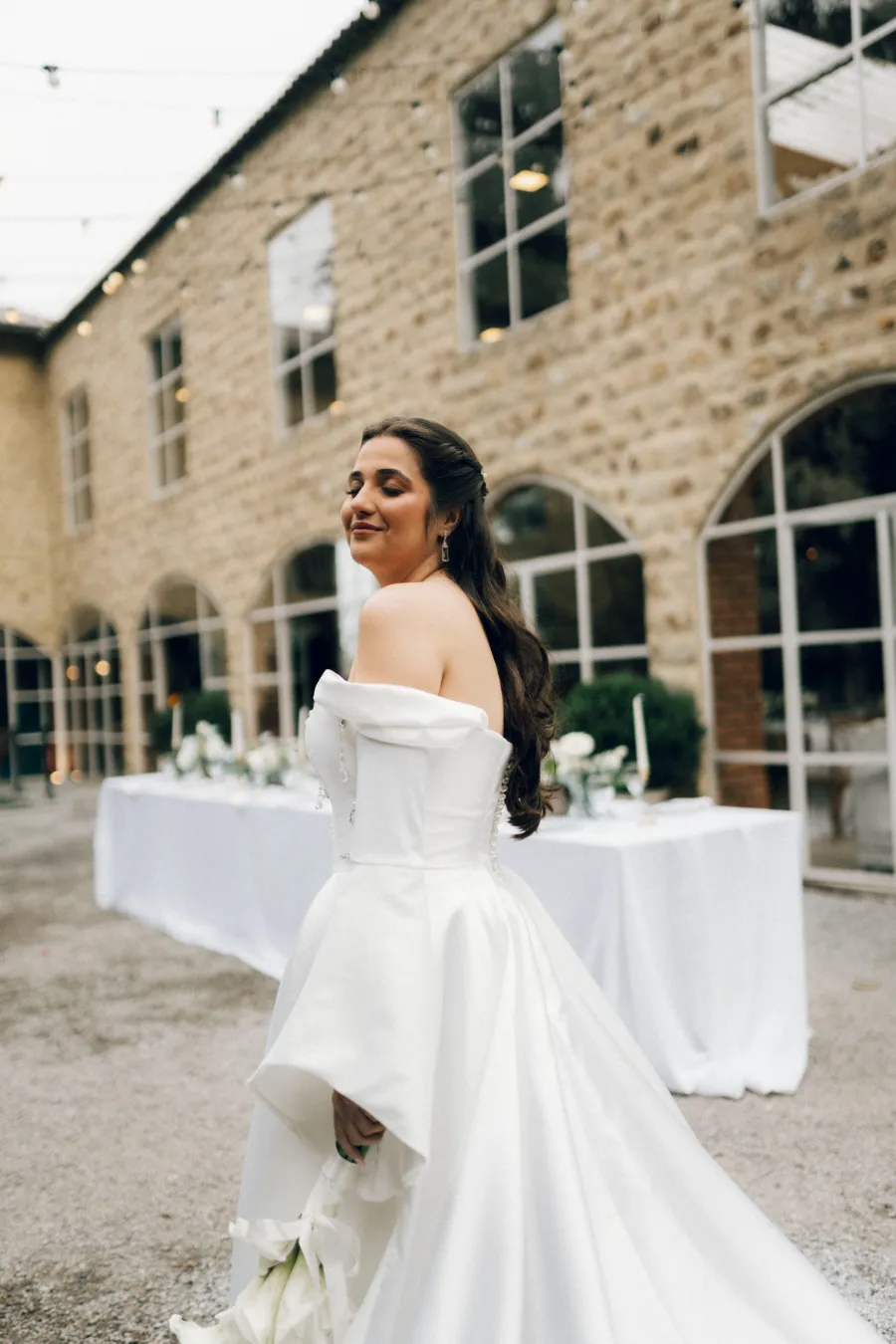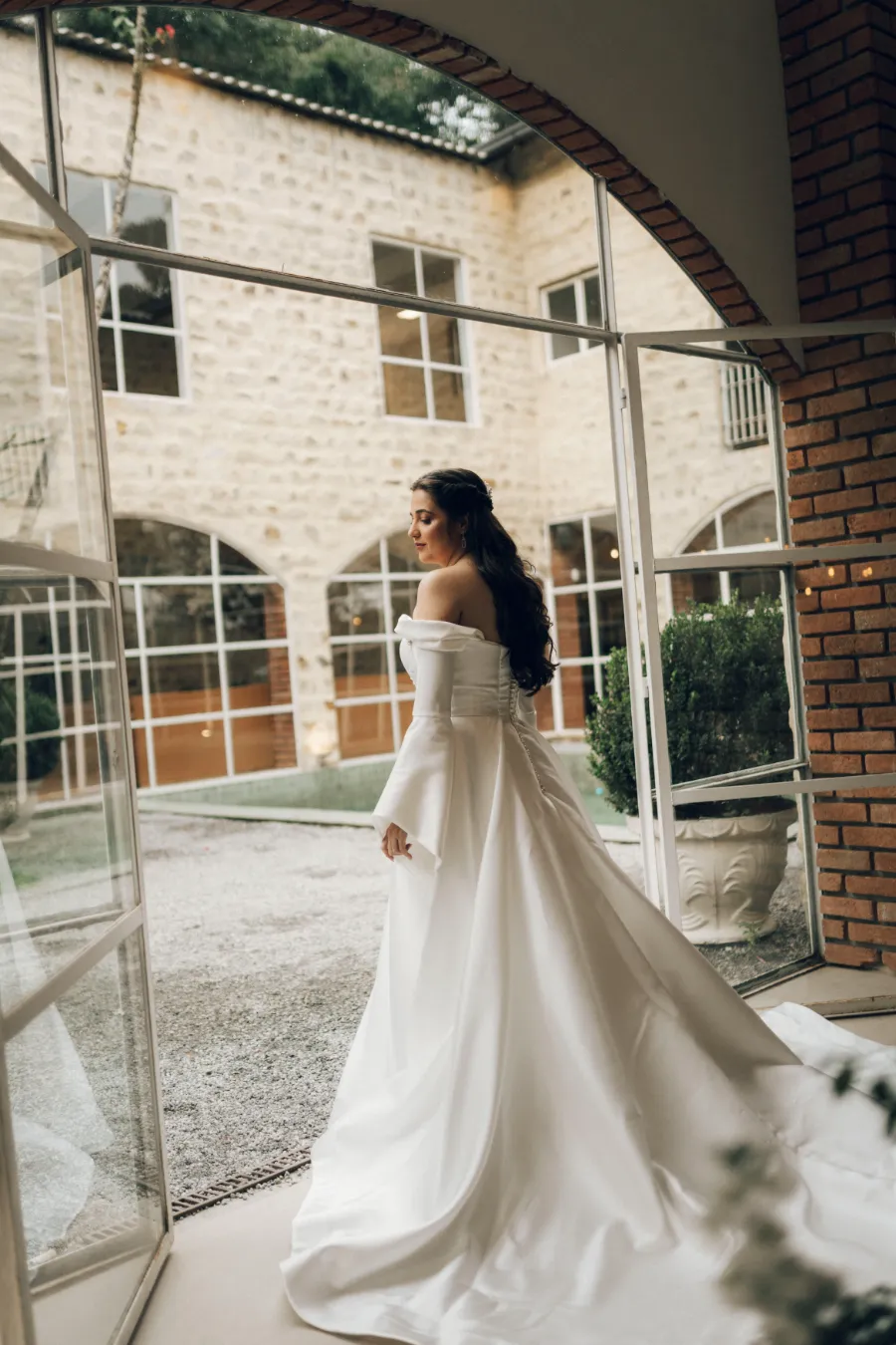 O vestido da noiva, versátil, quase um 3 em 1, com mangas removíveis e bolsos