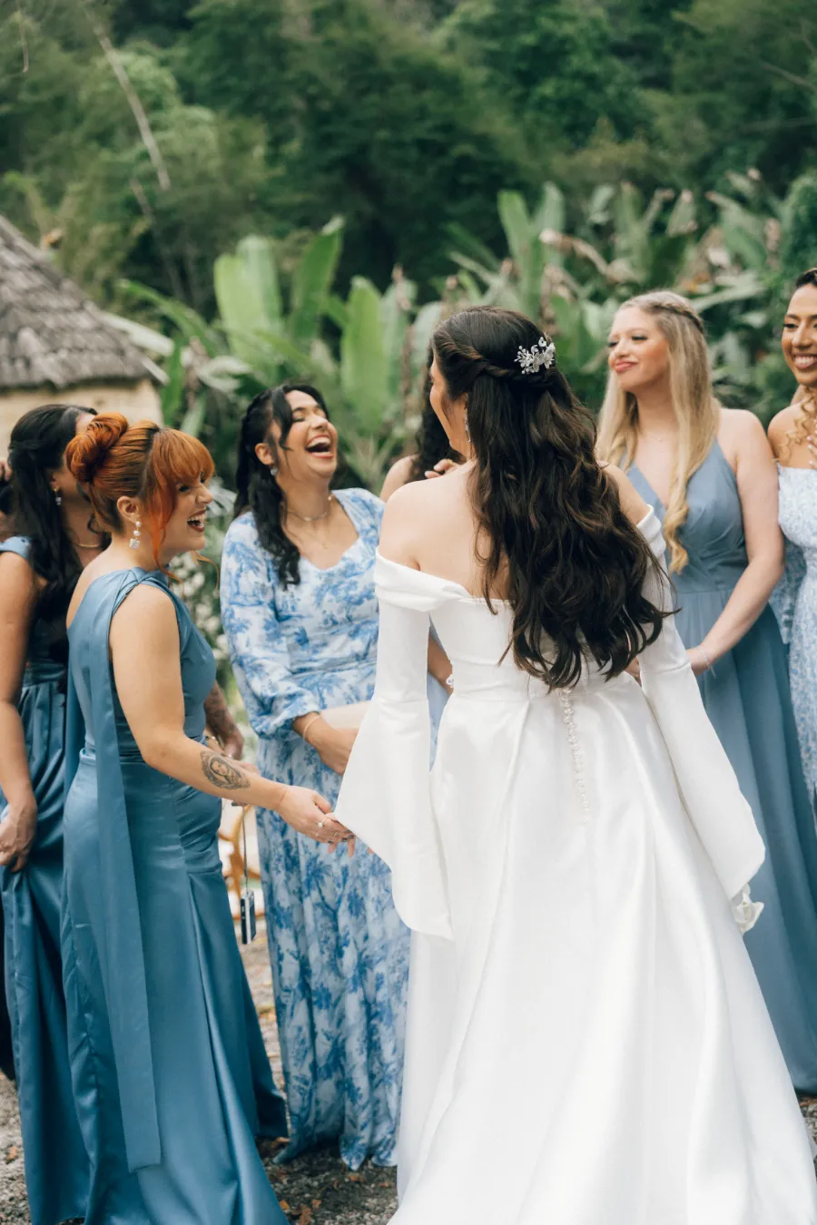 Todos esses detalhes, somados às madrinhas de azul serenity, resultaram em um casamento autêntico e cheio de personalidade.
