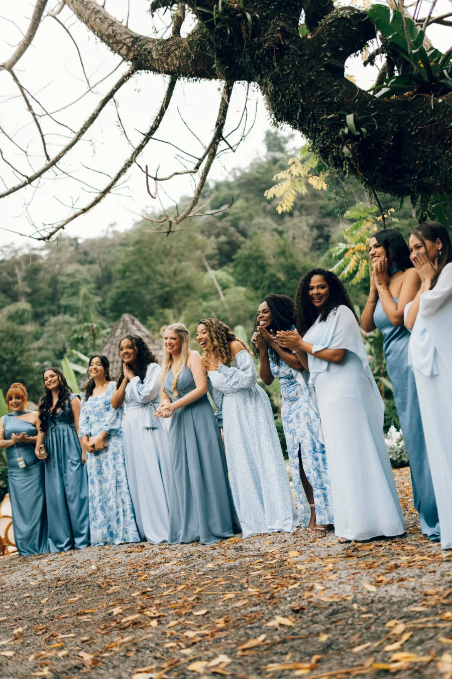Todas estavam lindas, vestindo tons de azul serenity e estampas florais que conversavam com a paleta escolhida.