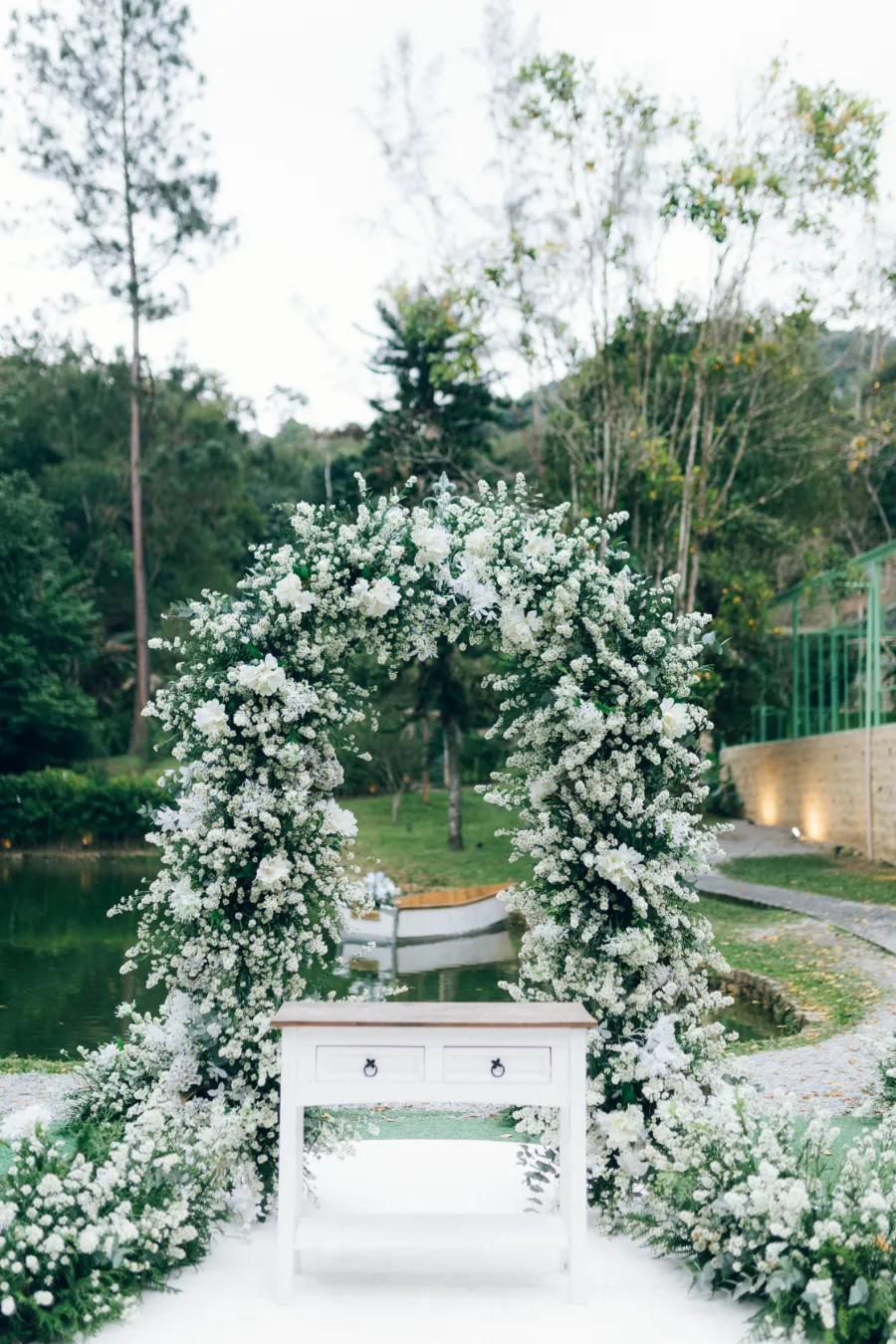 A decoração foi pensada na paleta verde e branco, com detalhes de azul, principalmente no look das madrinhas.