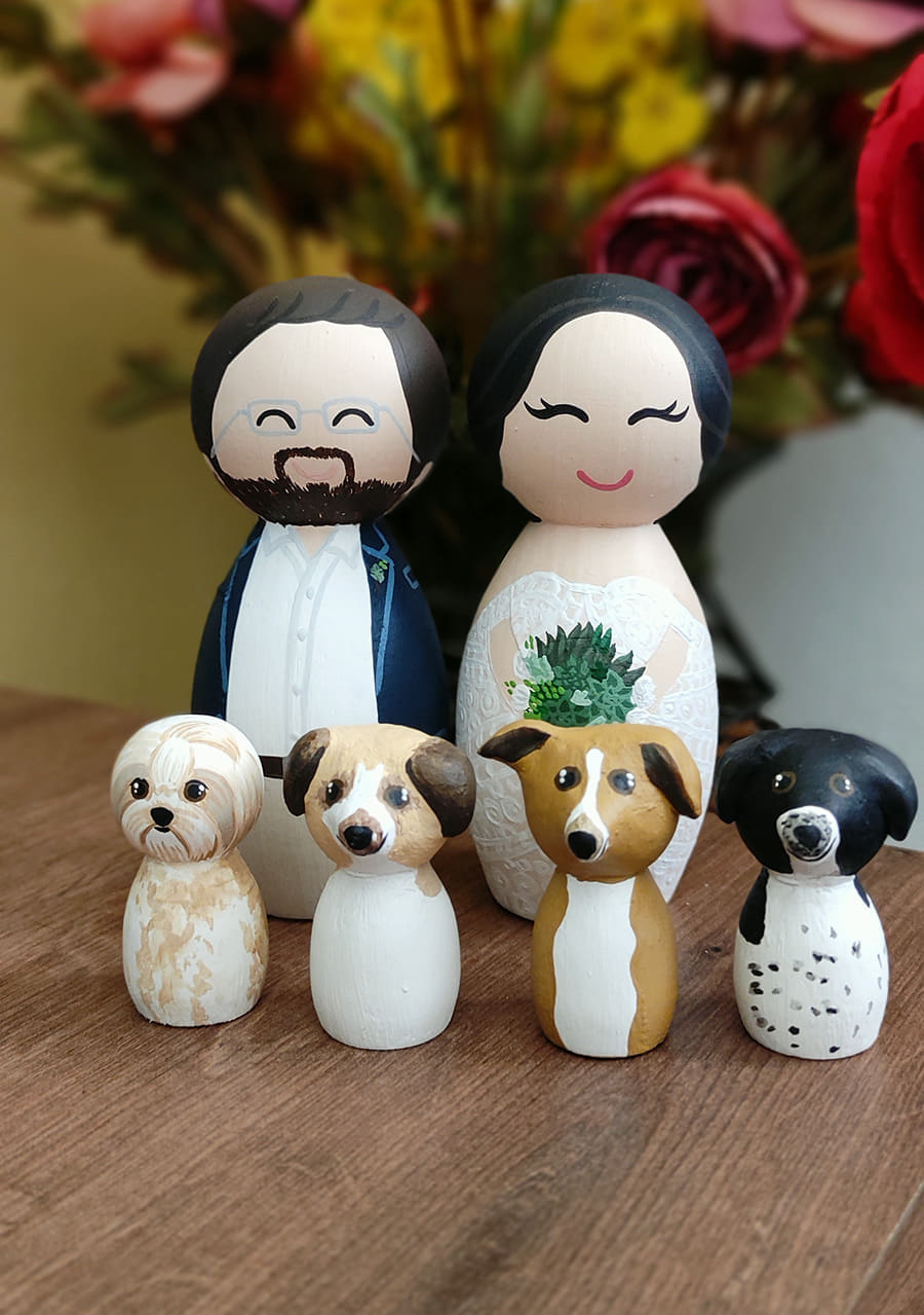 O Marcela Ferreira Ateliê confecciona noivinhos de madeira personalizados encantadores, com os detalhes e características que os noivos desejam ver representados, como as roupas que estarão vestindo, a cor dos cabelos, a forma dos rostos e outros detalhes únicos.