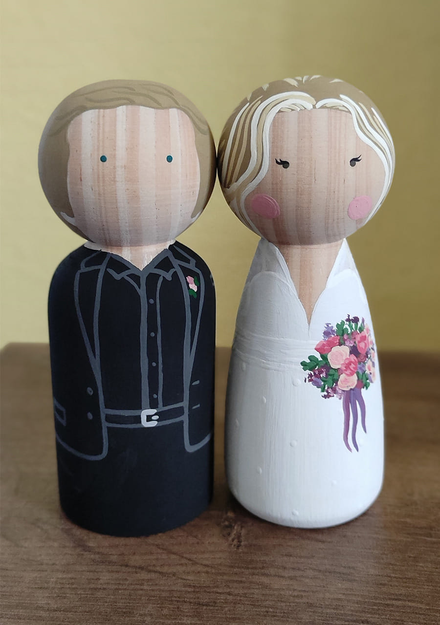 O Marcela Ferreira Ateliê confecciona noivinhos de madeira personalizados encantadores, com os detalhes e características que os noivos desejam ver representados, como as roupas que estarão vestindo, a cor dos cabelos, a forma dos rostos e outros detalhes únicos.