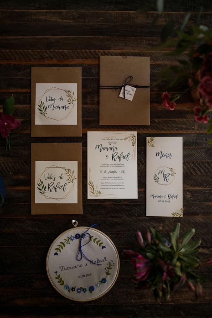 Toda a papelaria do casamento foi desenvolvida pela Mariana e pelo Rafael. Juntos, idealizaram e montaram toda a identidade visual, e horas dos finais de semana passaram construindo essa identidade, desde o save the date, até os menus. Escolheram seguir uma identidade com figuras geométricas, detalhes metálicos e folhagens, o que remetia a própria decoração do casamento.
