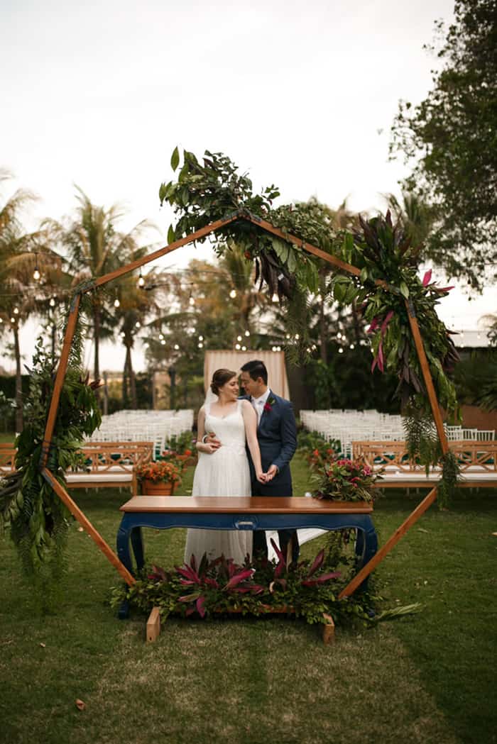 Por isso também queriam um arco geométrico para a cerimônia, feito em madeira. E esse tal arco foi feito pelo sogro da Mariana, com todo o carinho do mundo! “Então siiiim, esse arco lindo das fotos foi um dos DIY do nosso casamento! Meu sogro mesmo levou no dia anterior e montou, deixou prontinho para receber a decoração e ser levado para o seu lugar.” E foi incrível que os convidados durante a festa e depois, nos dias que seguiram, vinham falar o quanto amaram o nível de detalhes, falar que tinham notado que o arco da cerimônia tinha a mesma forma geométrica do menu, que era semelhante a da pista, e a pista seguia o convite do casamento, e por aí vai. “Amei que notaram!”