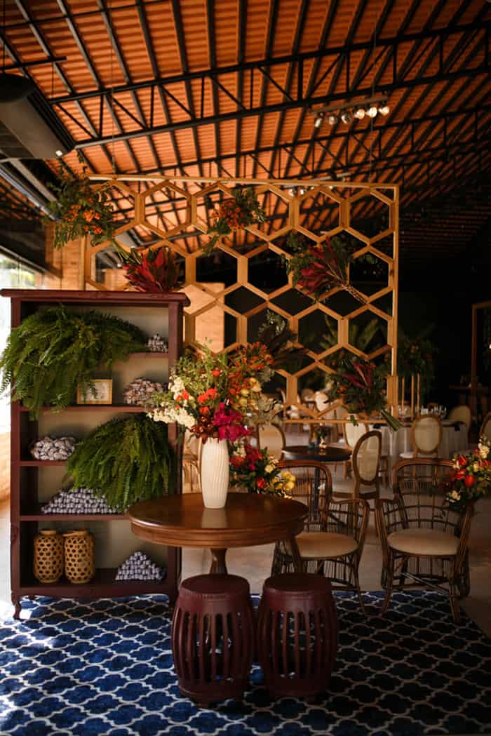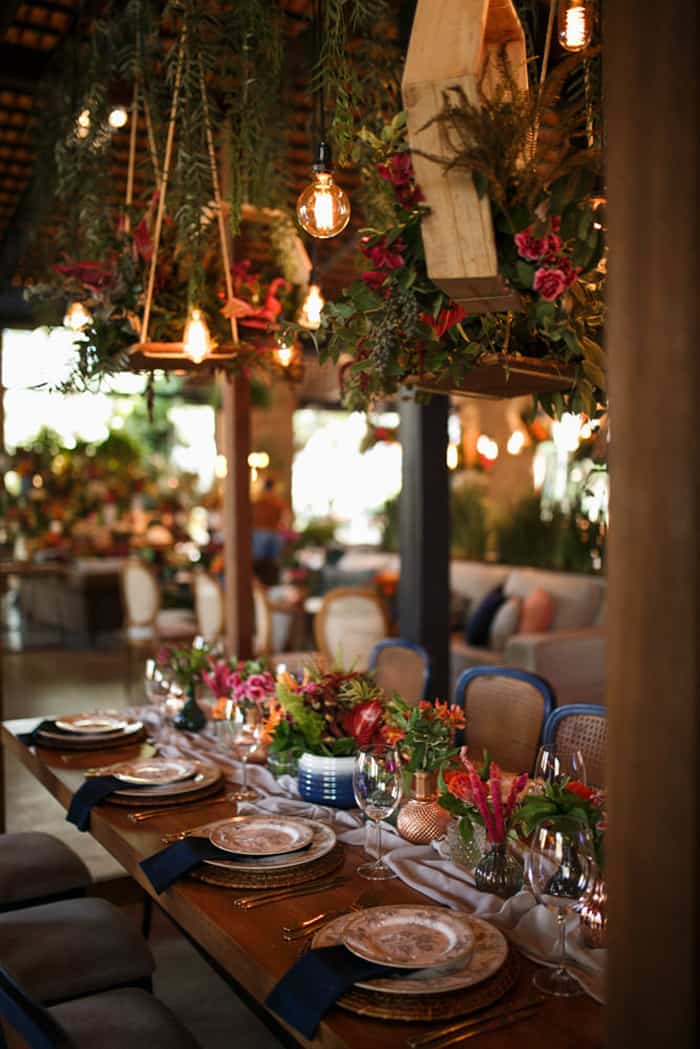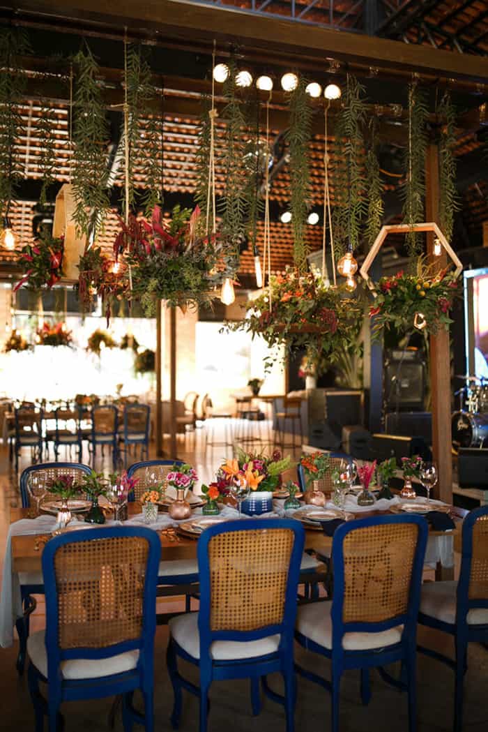 A Mariana falou para a decoradora que queria muito verde, muitas folhagens, elementos metálicos em cobre e dourado, e a sua cor favorita: azul. Coincidentemente, a mesma eleita cor de 2020 pela Pantone! “Não estabeleci paleta de cores para as flores, mas falei que queria muita vida, muita cor! Aliás, para os vestidos das madrinhas, pedi que escolhessem cores vivas, cores de flores e de natureza. Queria a primavera todinha comigo.”