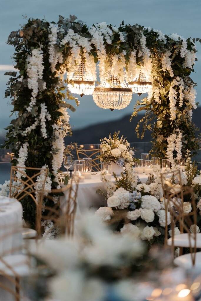Por outro lado, o chic envolve flores delicadas, muitas luzinhas, elementos em vidro e dourado.
