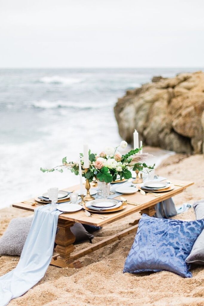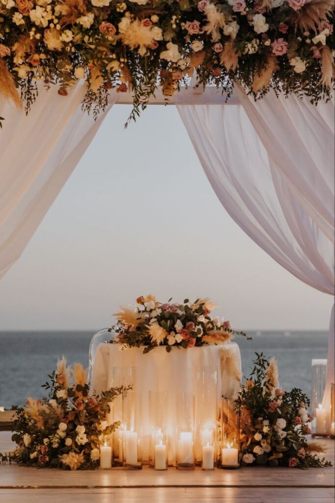 Se você sonha com um casamento pé na areia, saiba que é possível montar a mesa dos noivos.