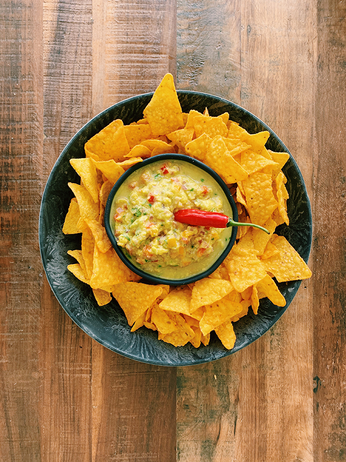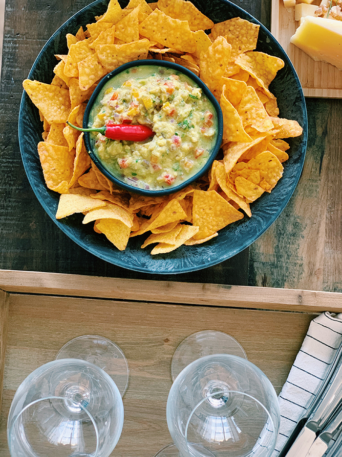 1 bowl  com um prato embaixo para o guacamole e nachos