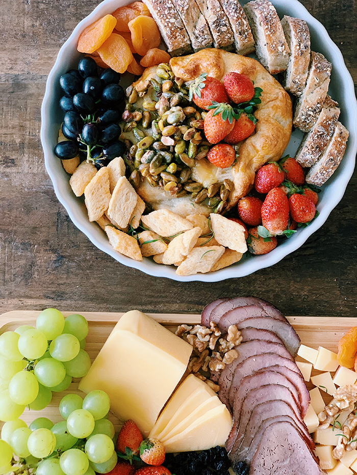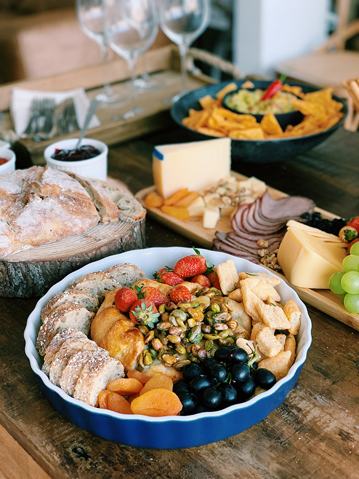 A grazing table da Lorena teve 3 opções de aperitivos: uma tábua de frutas, queijos e embutidos; um brie recheado e guacamole.