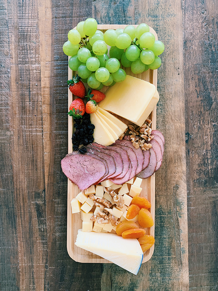 O coração de uma grazing table são as gostosuras dessa tábua! O conjunto de elementos deixa a mesa colorida e alegre. O melhor é que você já pode deixar os queijos e embutidos fatiados para facilitar e incrementar com geleias, mel, frutas secas, flores comestíveis ou patês.