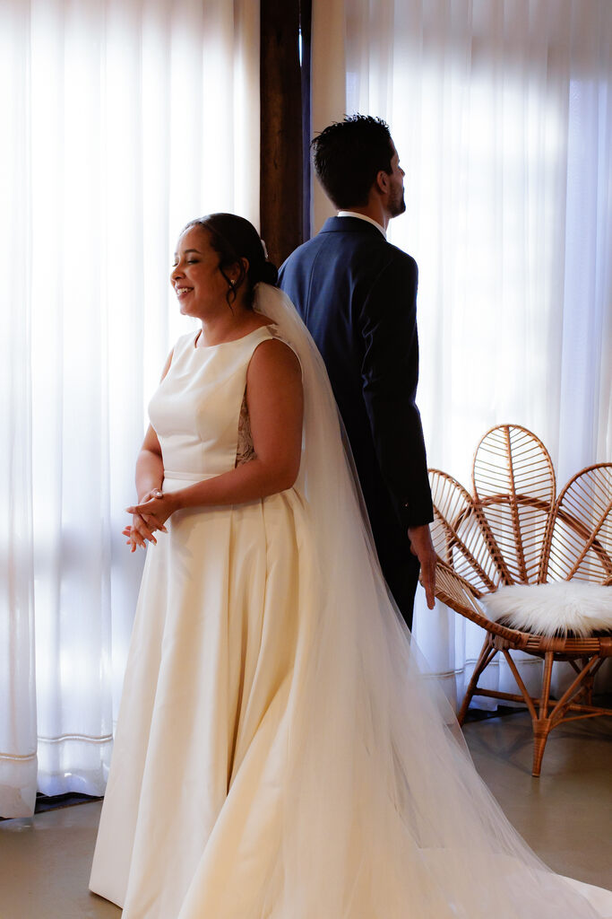 Tive um first look fofo com meu pai e avô. Surpreendi meu noivo com um relicário do seu avô e que foi entregue pela mãe dele no meu lugar.