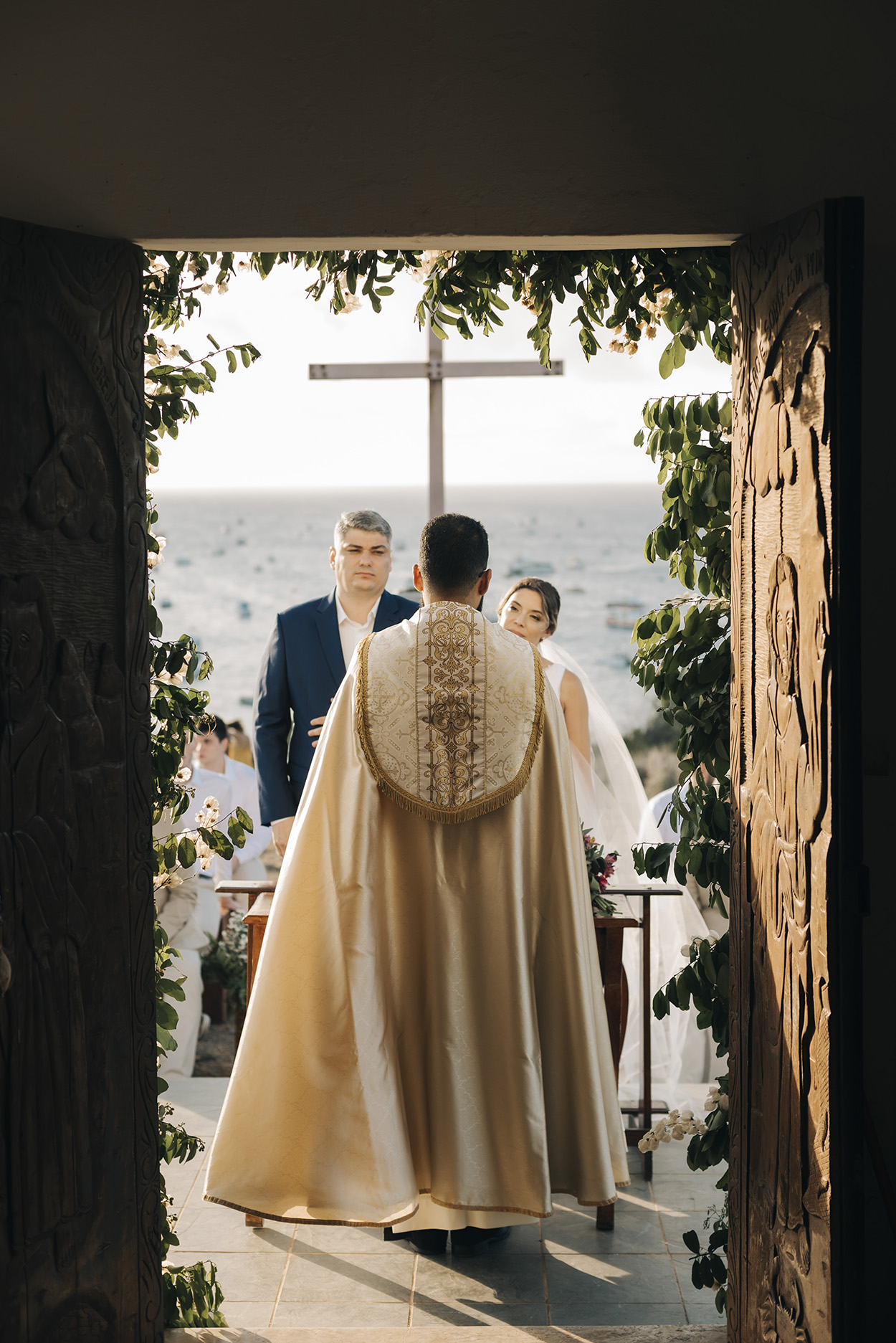 A cerimônia aconteceu, em frente a uma capela, com direito à vista do mar.