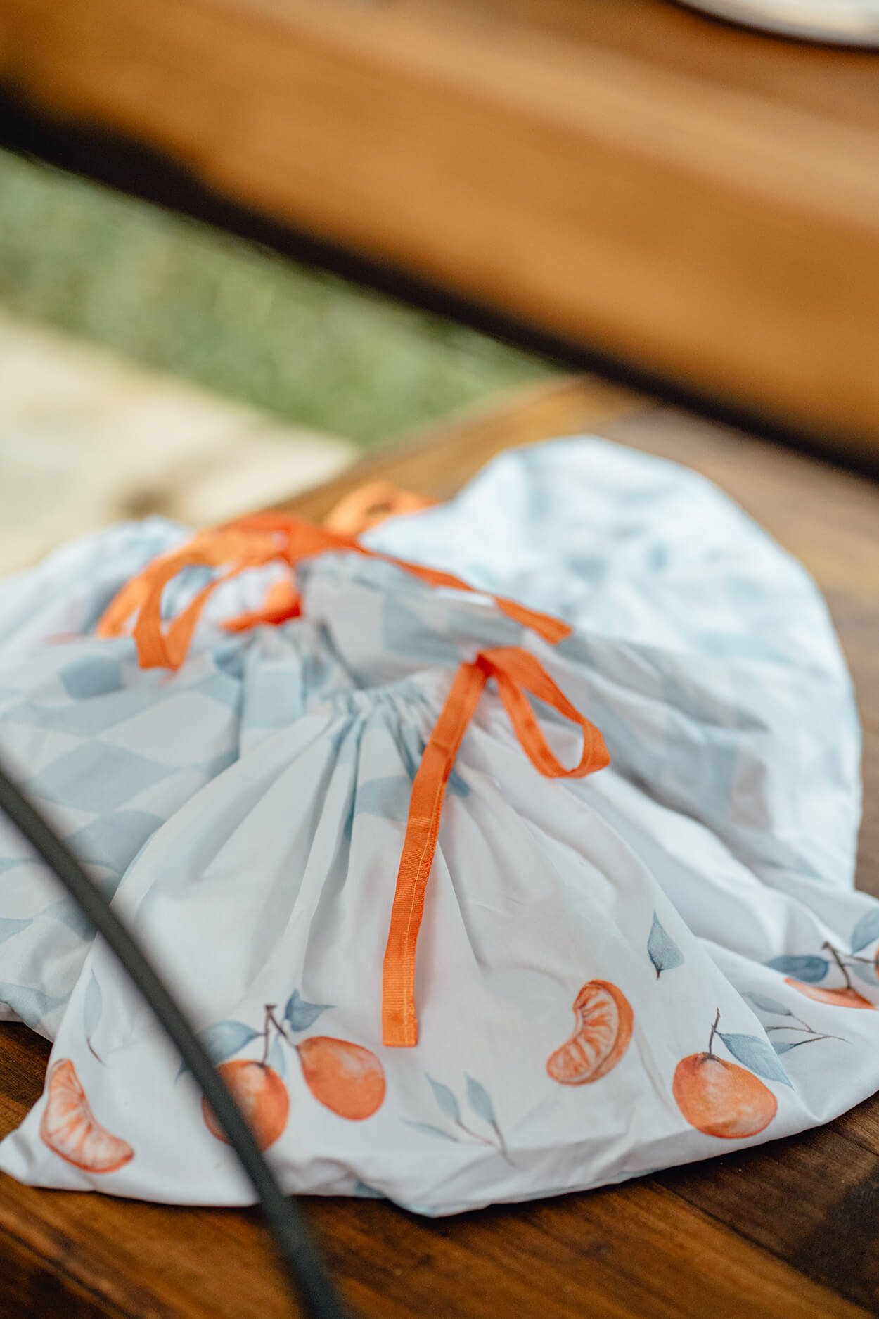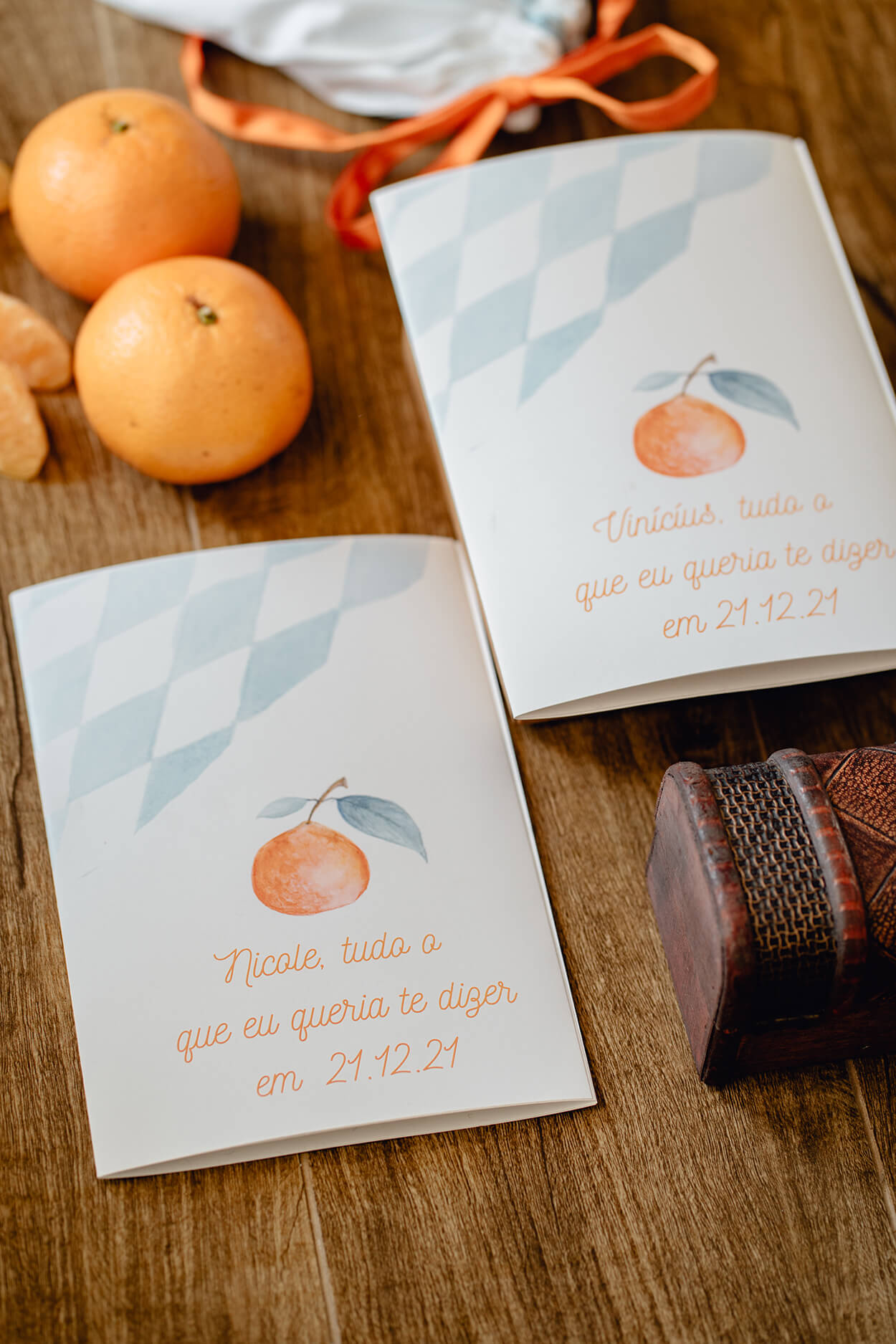 Tudo foi planejado com muito carinho, como os lugares americanos que foram de um tecido feito especialmente com a mesma aquarela do convite, com xadrez em homenagem a toalha do picnic do primeiro encontro e as bergamotas, uma das frutas favoritas do casal.