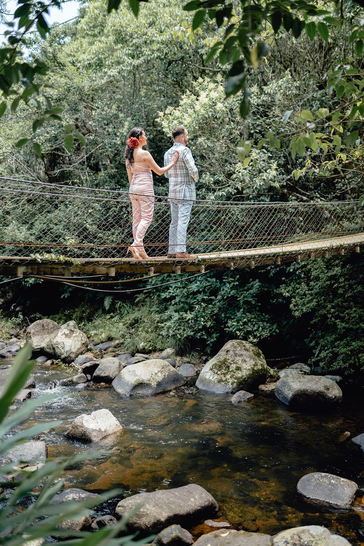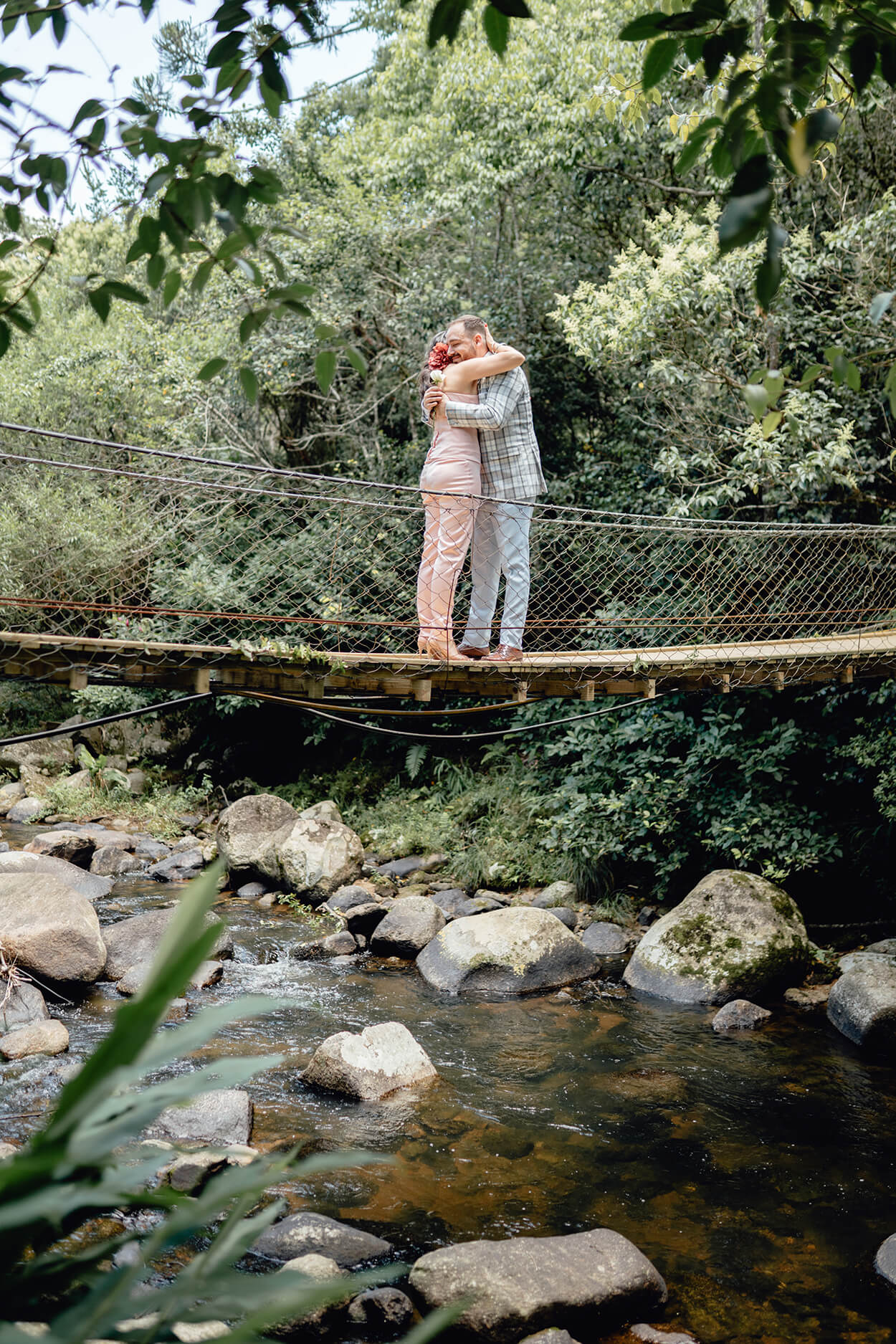 E para fechar esse dia especial, os noivos realizaram um first look, mas com o look incompleto. “Casamos em um sitio, maravilhoso, que parece um bosque encantado. E tem um rio que atravessa a propriedade. O first look foi na ponte pendente, sobre o rio, o Vinicius me esperou lá, com uma rosa e viu o meu look semi completo (guardei a capa e o fascinator para a cerimônia)”.