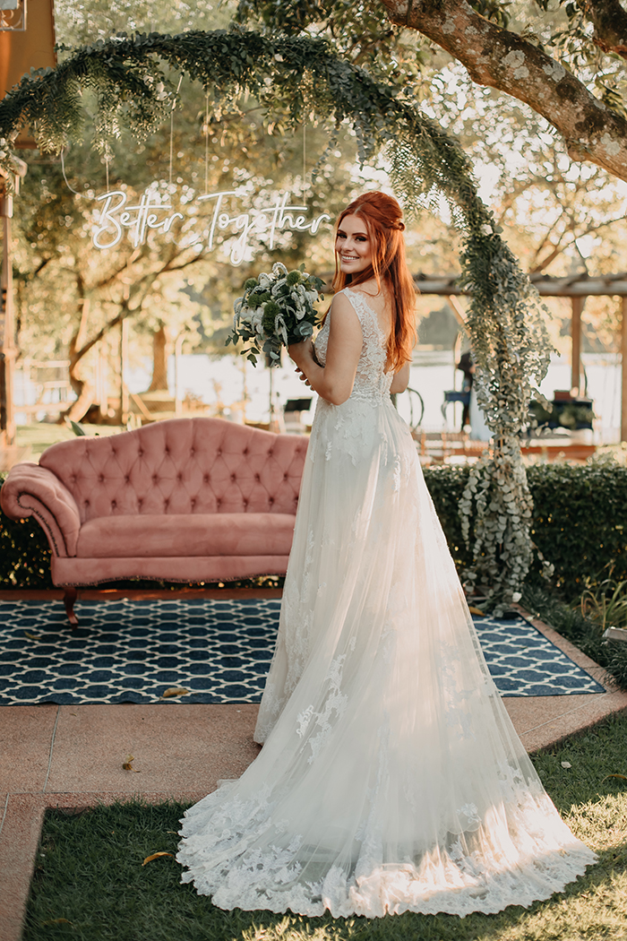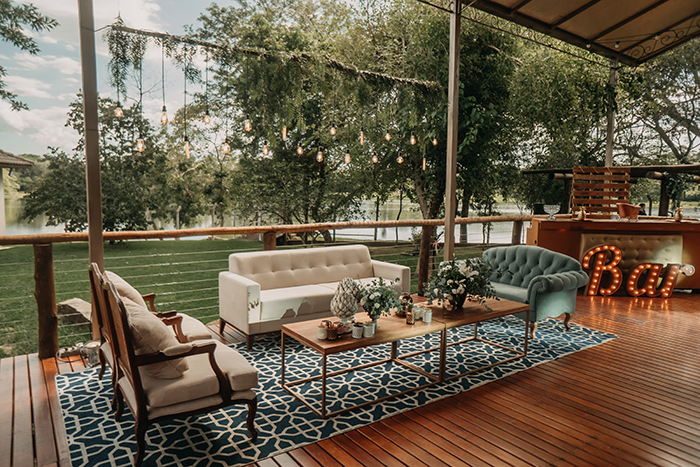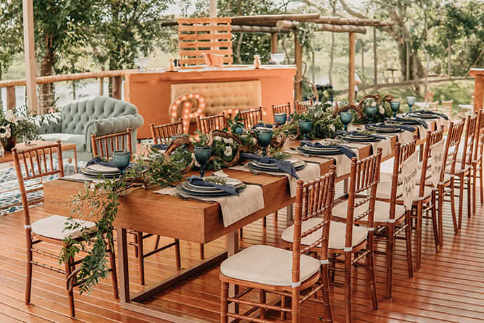 A decoração no estilo boho chic inspirado nos casamentos da Toscana, ficou bem charmosa nos tons rosa e azul. E contou com detalhes como o letreiro “better together” que amamos!