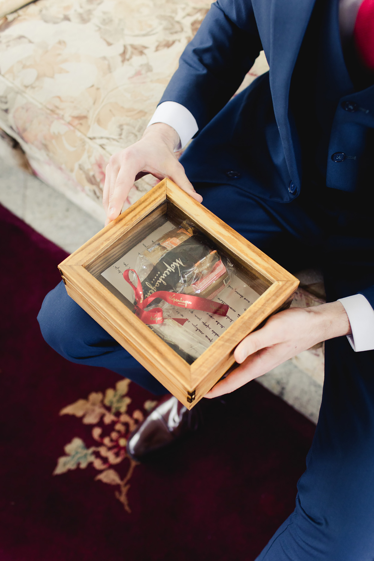 Assim, como a reação do Marcelo ao receber a surpresa que a noiva preparou, um ensaio boudoir. “Entreguei as fotos reveladas em uma caixinha, com uma carta e chocolates e a Dani fotografou a reação dele ao receber, o que foi ótimo de ver depois”.