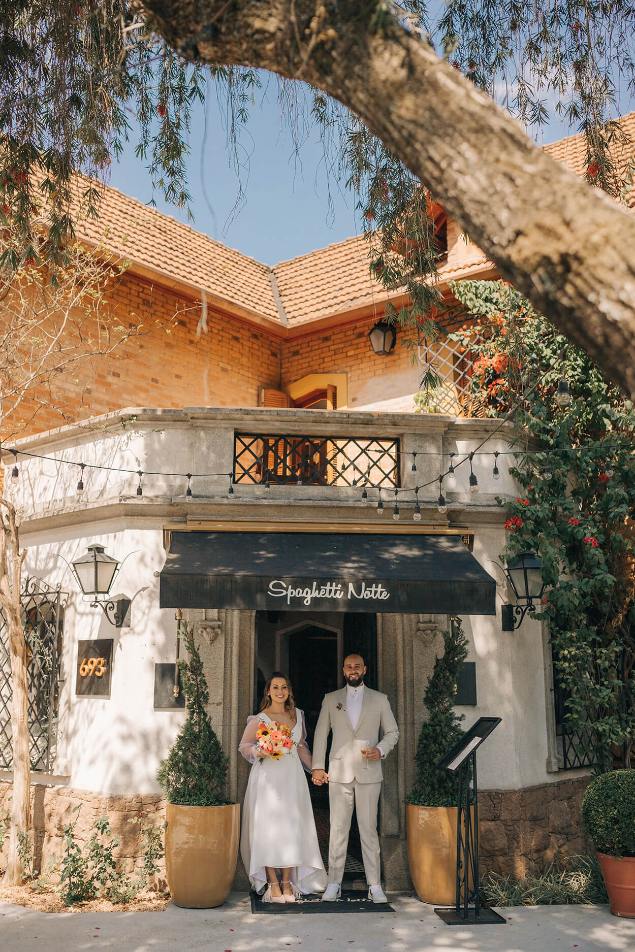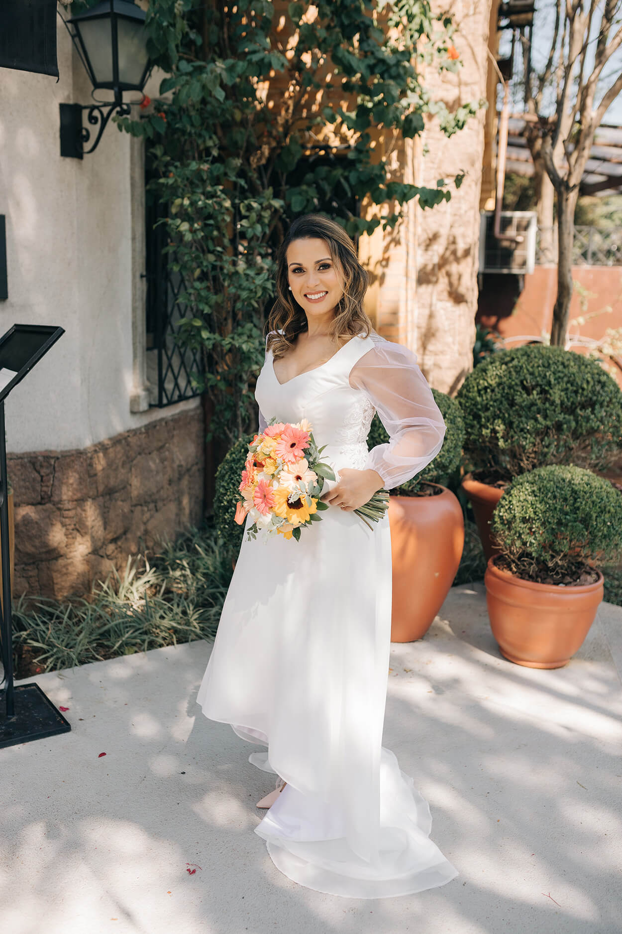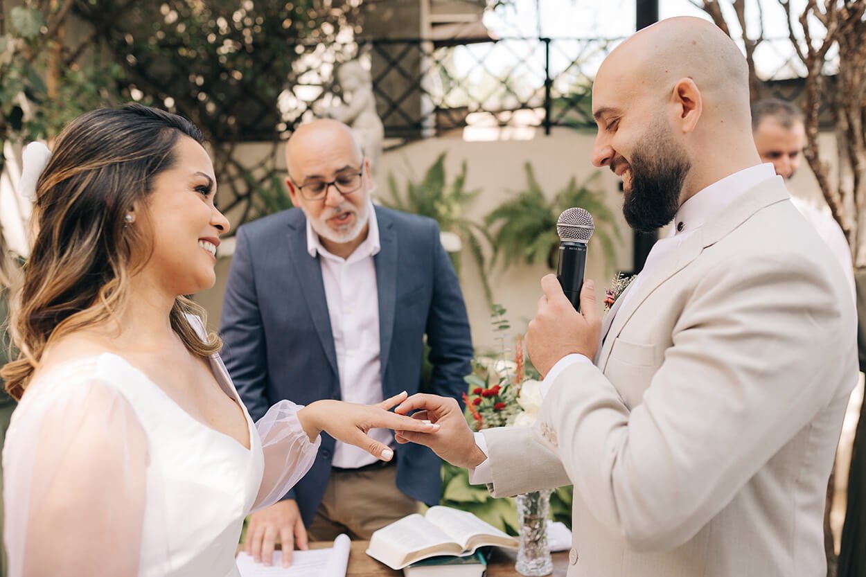 O buquê todo colorido adicionou uma pegada divertida a produção da noiva. Aliás, o vestido foi uma ótima escolha, um modelo minimalista mas que também soube incorporar a informalidade das mangas bufantes. O noivo também aproveitou essa vibe e balanceou o look com um par de tênis casual.