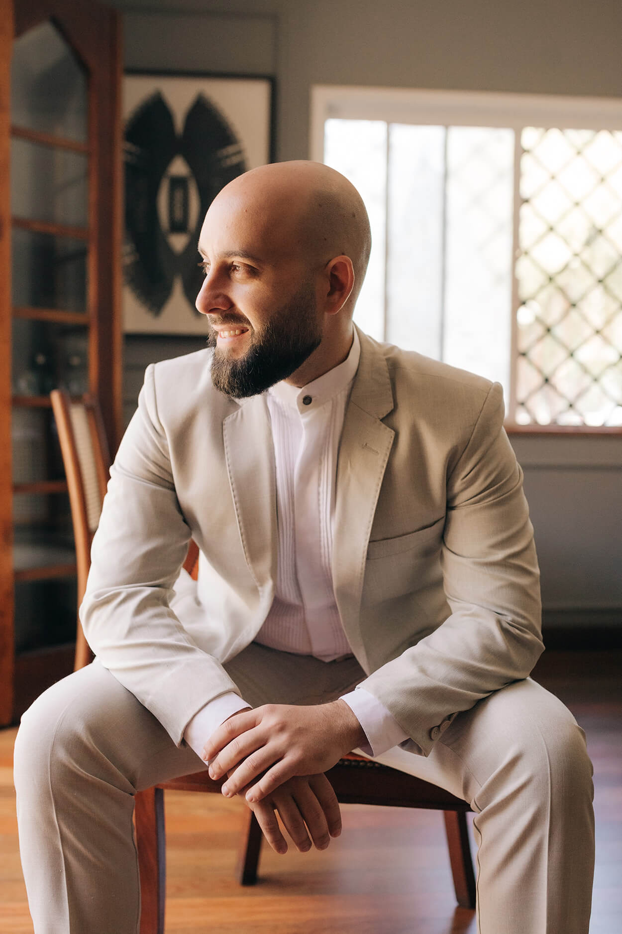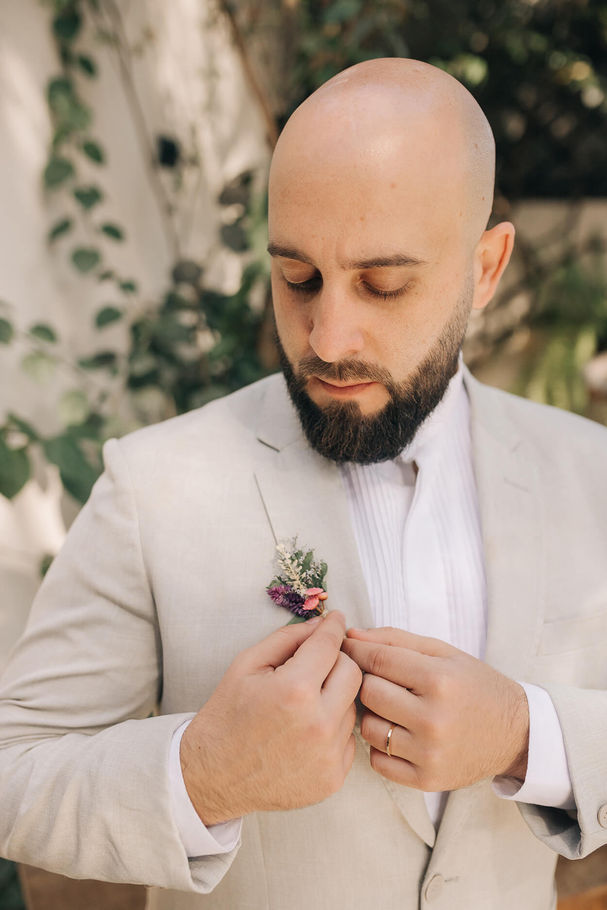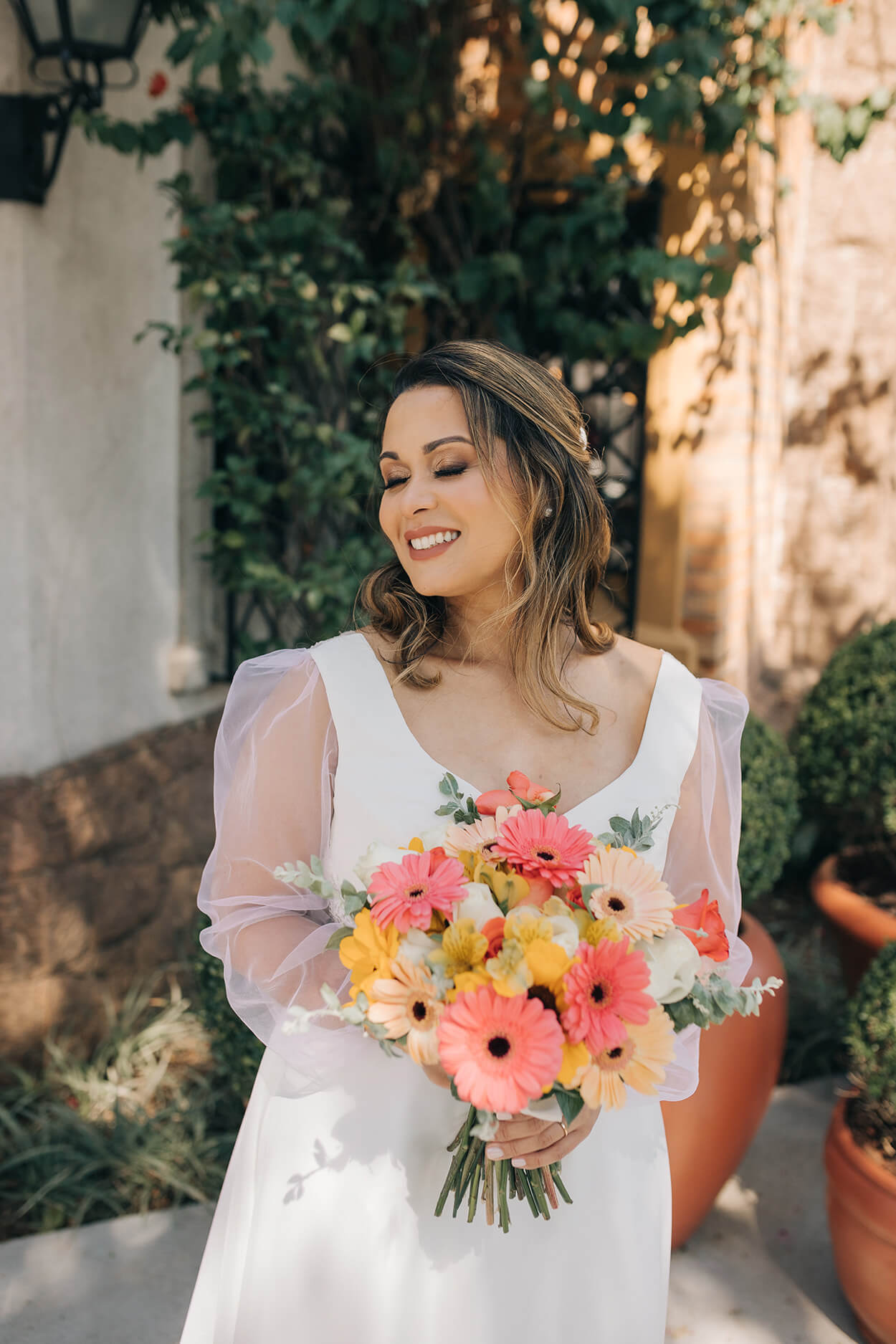 O buquê todo colorido adicionou uma pegada divertida a produção da noiva. Aliás, o vestido foi uma ótima escolha, um modelo minimalista mas que também soube incorporar a informalidade das mangas bufantes. O noivo também aproveitou essa vibe e balanceou o look com um par de tênis casual.