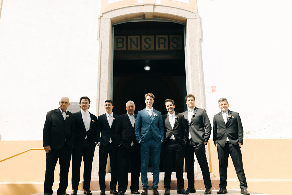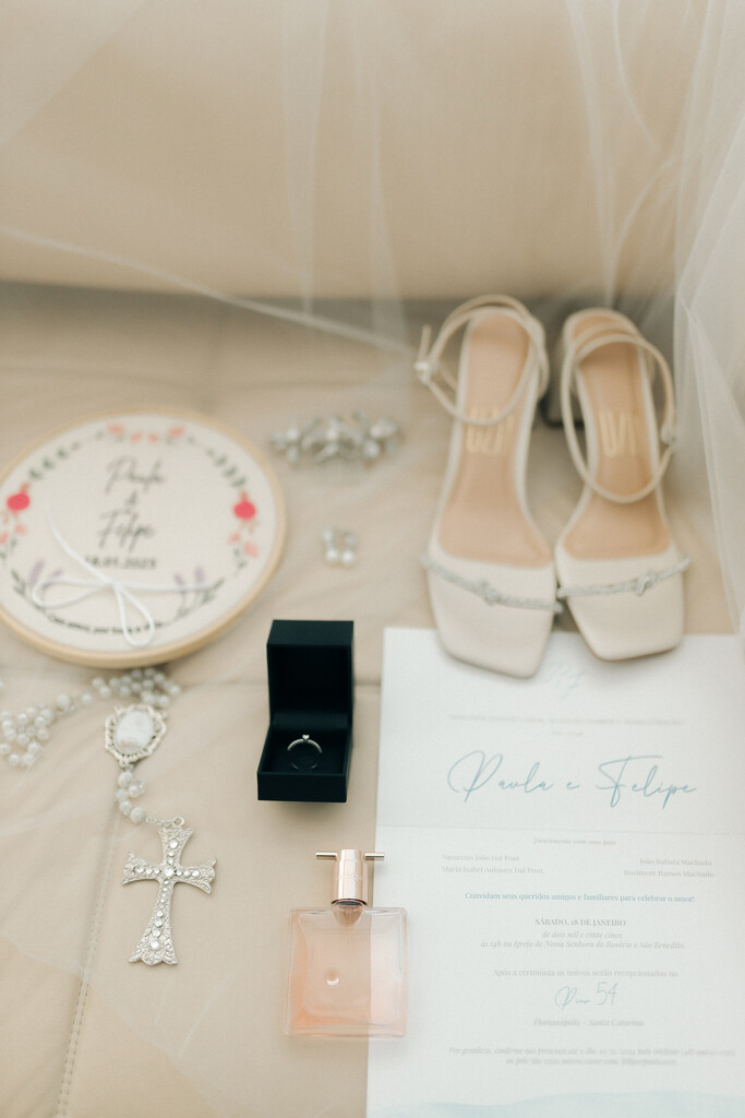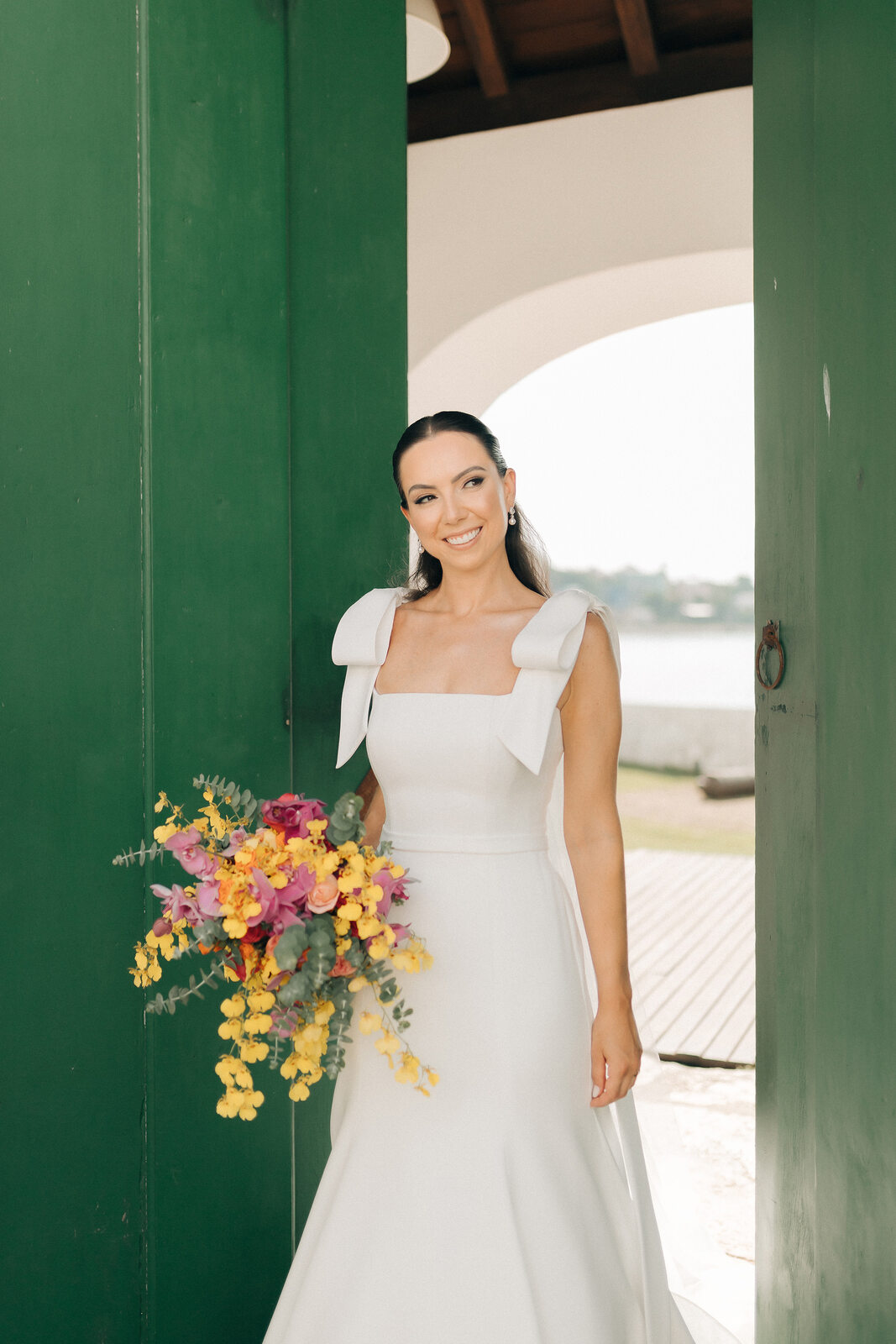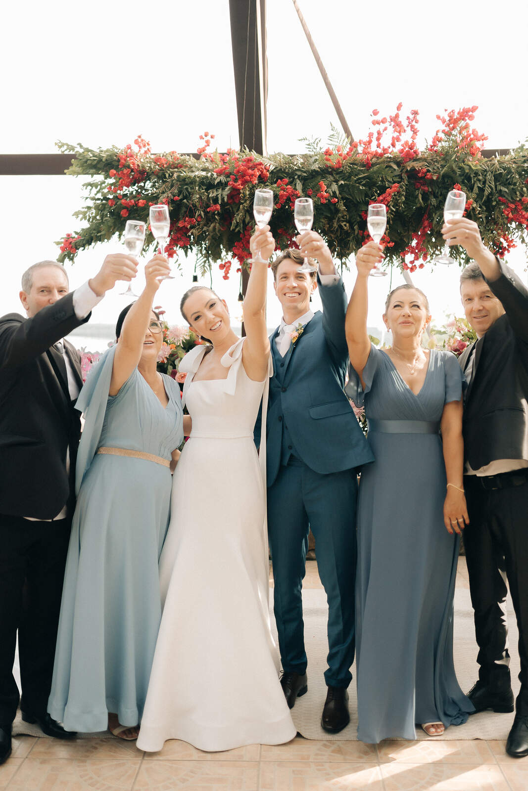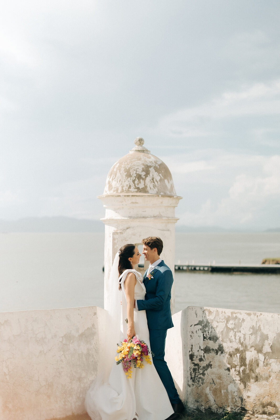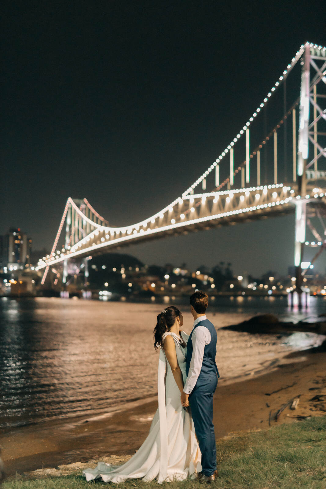 “Foi um mini wedding para 60 pessoas, aos pés da ponte Hercílio Luz, no final de tarde, proporcionando uma experiência incrível para os convidados.