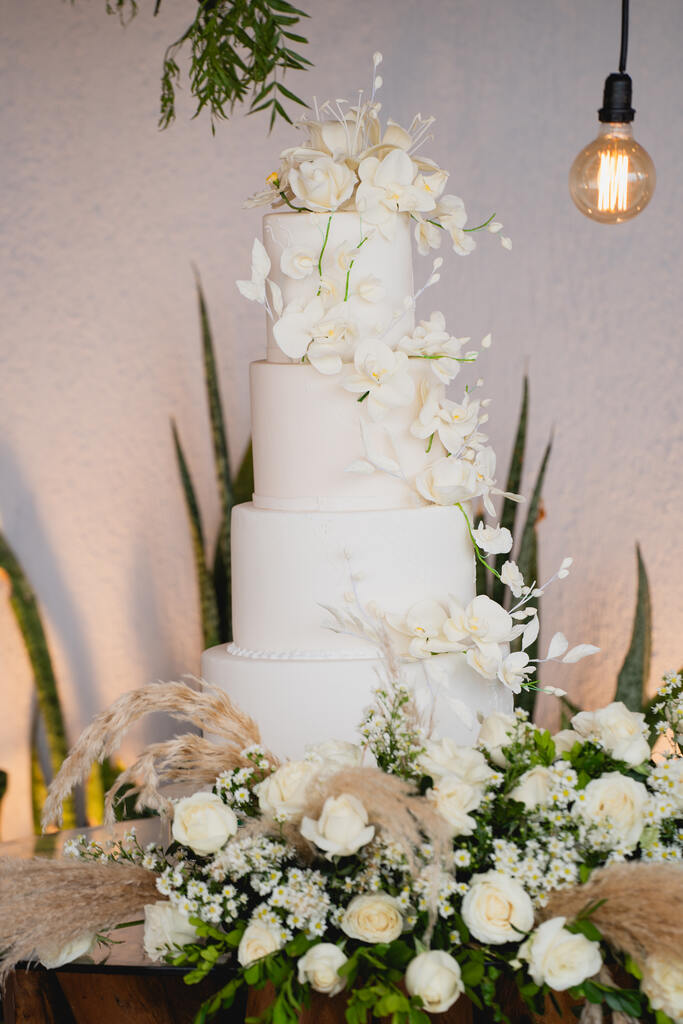 mesa com doces de casamento e flores brancas