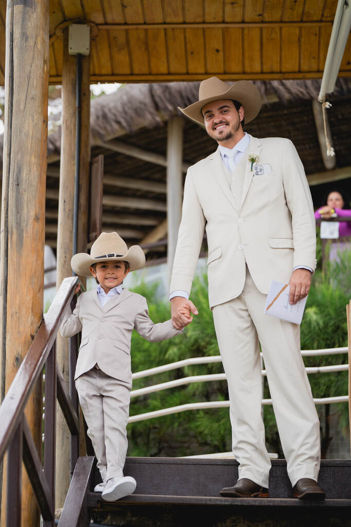 Quase sempre os pajens de casamentos ao livre, delicados e boho usam o conjuntinho calça, suspensório e gravata borboleta.