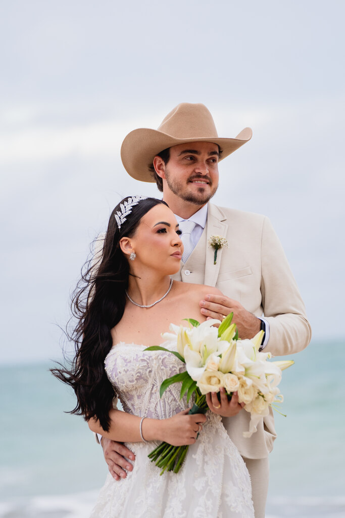 Esse casal aproveitou todos preparativos! Teve noivado, a despedida de solteira, ensaio pré wedding no estilo country, casamento na igreja, ensaio na praia e, por fim, o casamento pé na areia.