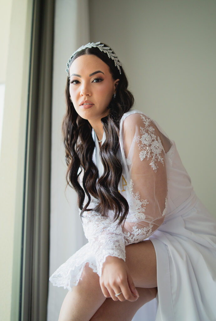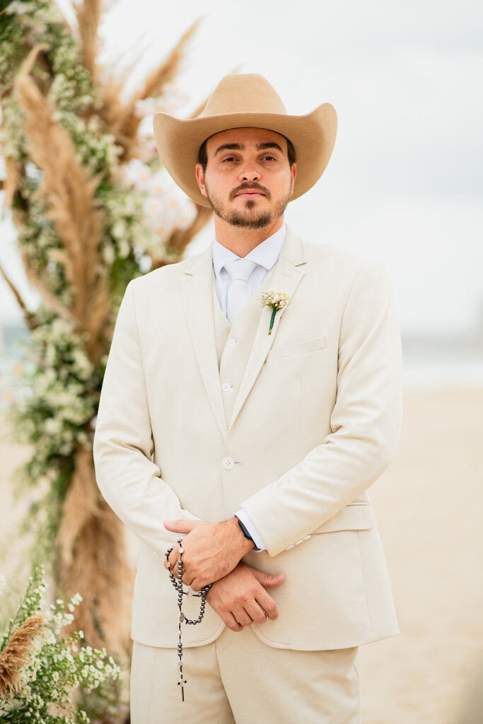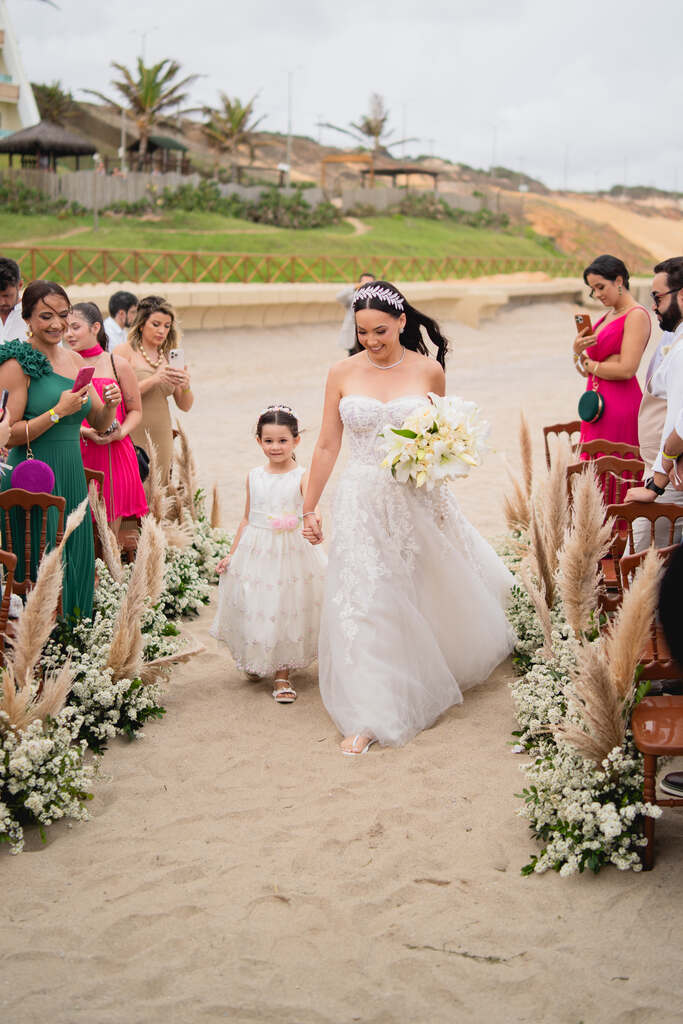 A noiva optou por um look bem elegante e estruturado para a praia. Poderíamos facilmente imaginar que ela se casaria em um salão ou em um espaço coberto no campo.