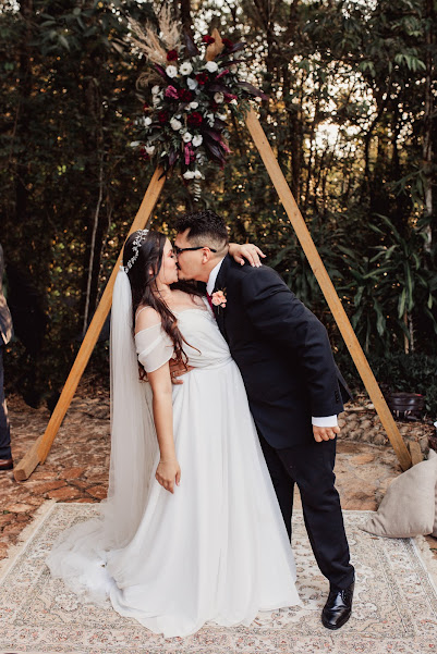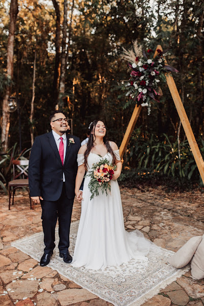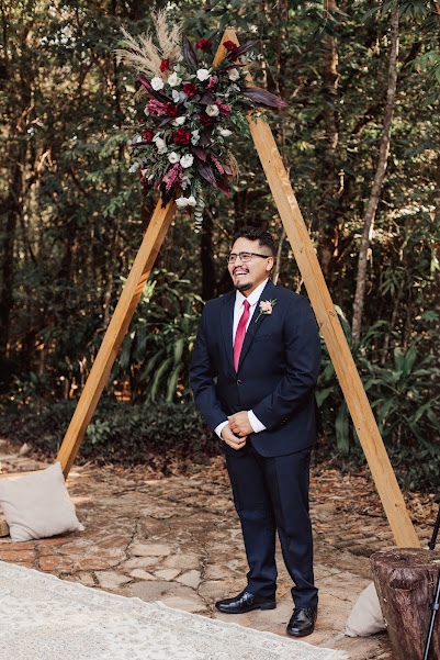Quando chegou o grande dia, eles escolheram um cenário em meio a natureza no Mato Grosso do Sul, numa cerimônia ao ar livre com uma belíssima decoração boho em tons de marsala, azul marinho, rosê e dourado para dizer SIM.