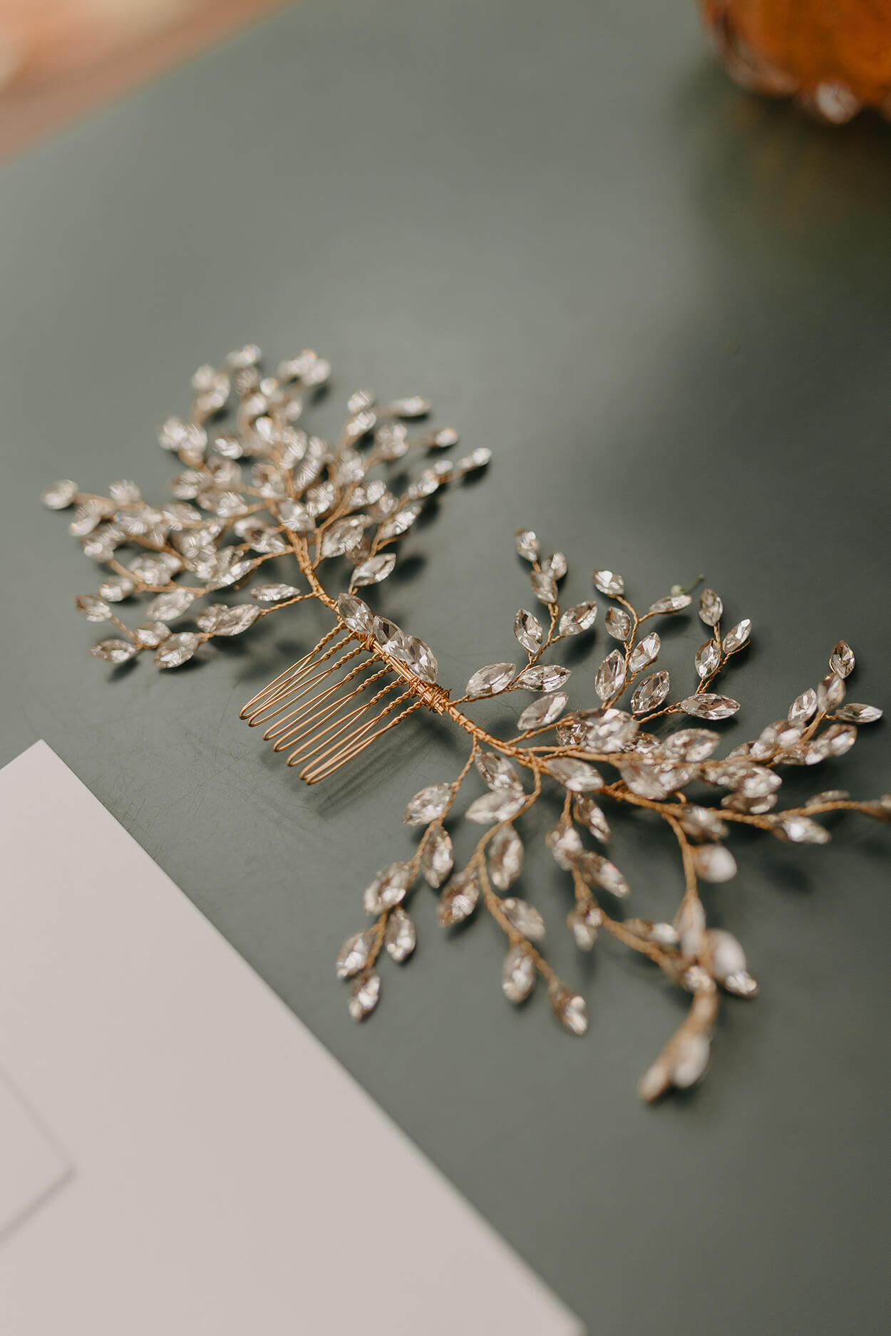 Seu coque baixo ganha três orquídeas em um amarelo quente e o penteado é finalizado com pedrarias elegantes.