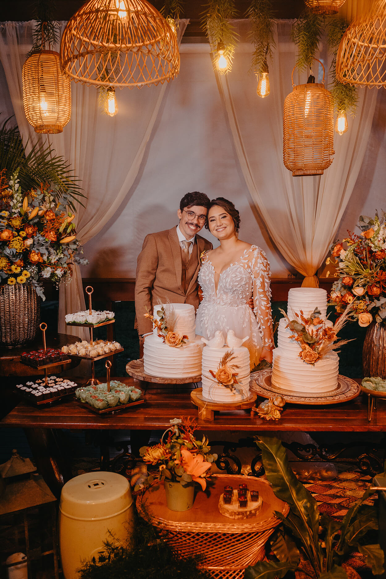 Agora vamos falar sobre o noivo. O terno com três peça por si só tem tudo para compor um visual mais sério, porém, o Bernardo deu seu toque descontraído à produção com um tênis casual branco.