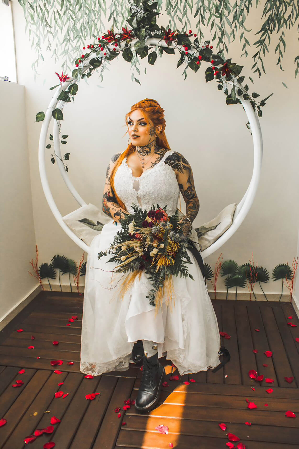 Tênis e coturnos costumam ser os queridinhos das noivas estilosas. E, para completar, o buquê foge da estrutura perfeitinha dos clássicos e recorre a diferentes flores para criar uma aparência diferenciada.