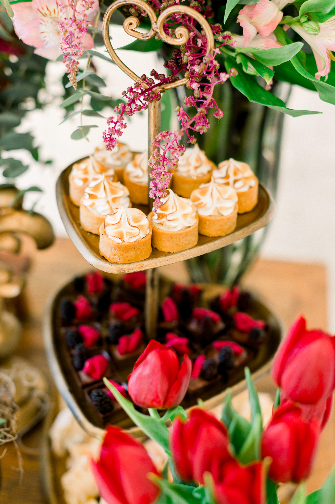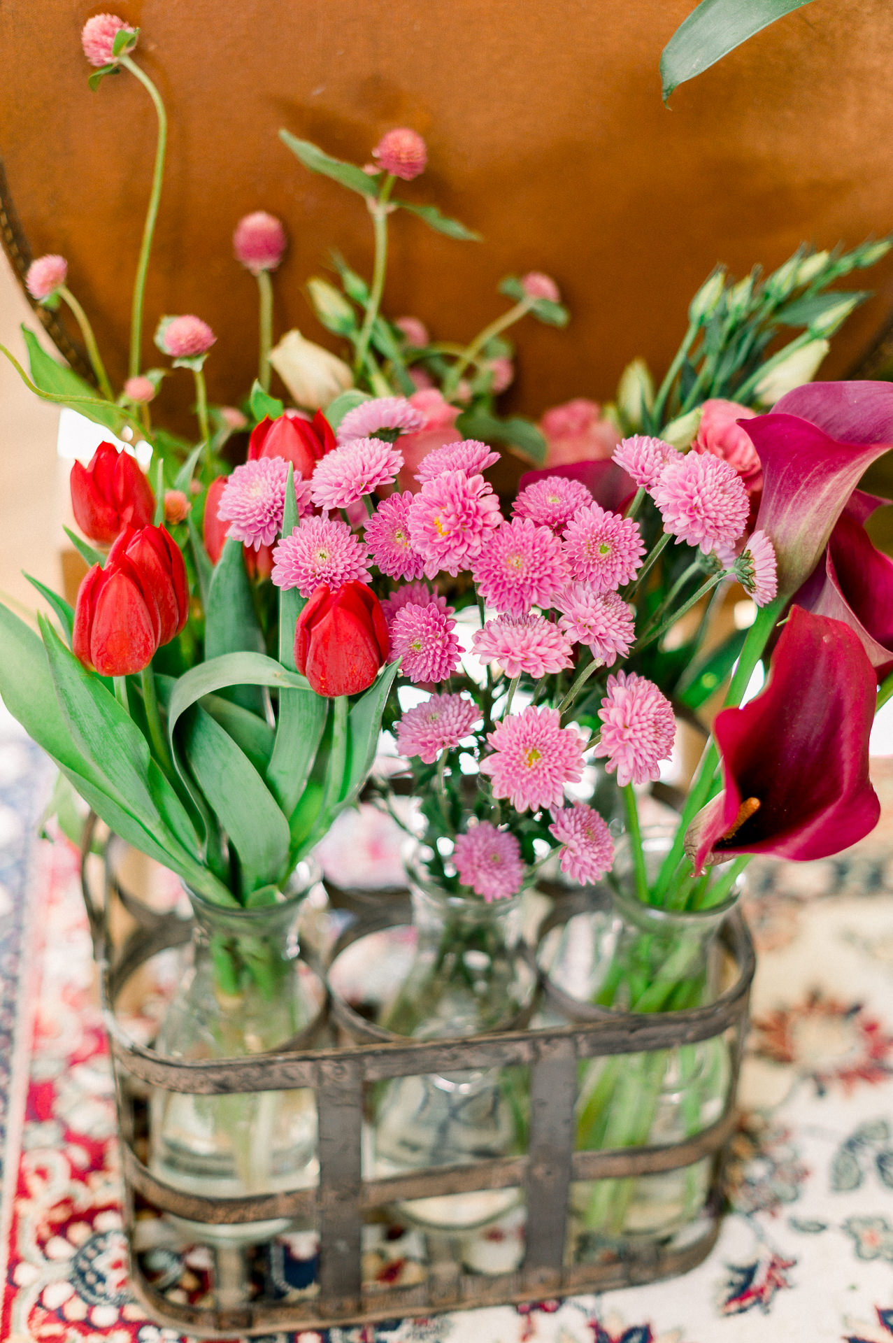 O casamento foi no inverno, então a Jéssica não queria cores frias, e sim cores mais alegres. Seguiram a opção de tons de rosa com pontos em vermelho para contrastar.