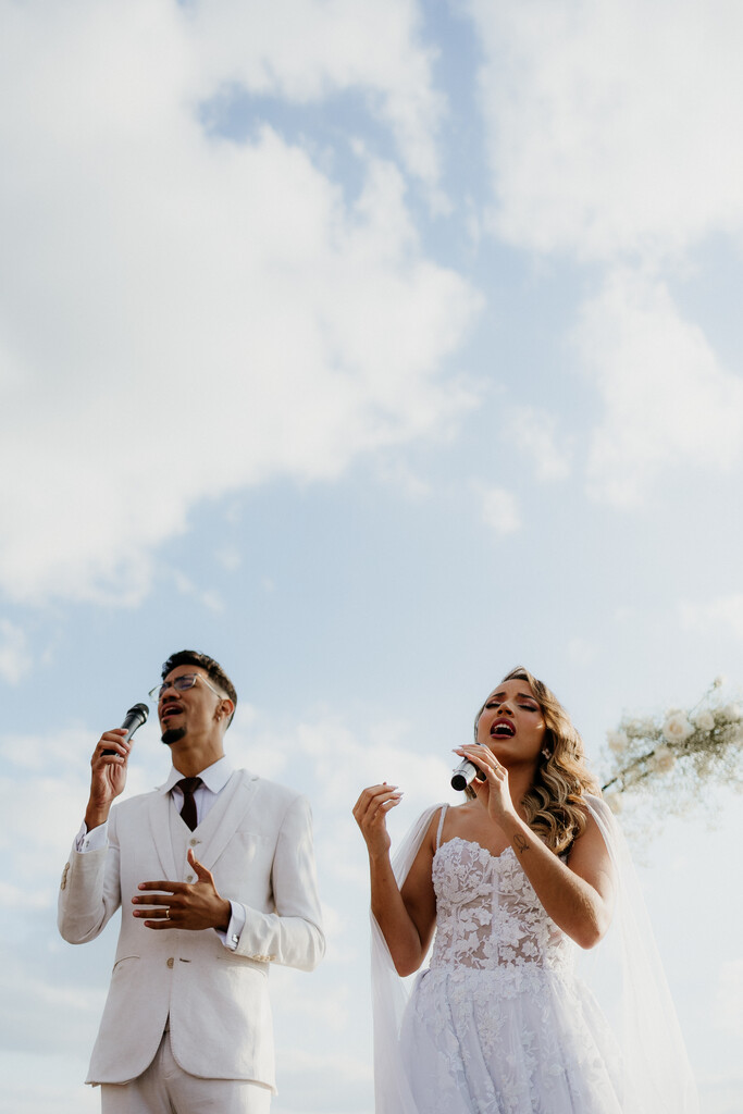 Os noivos cantaram no altar, teve first look com as madrinhas e vários momentos emocionantes.