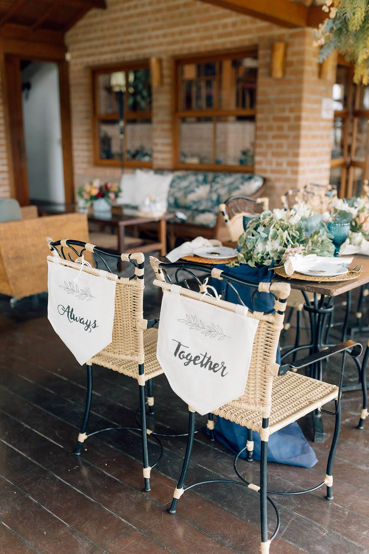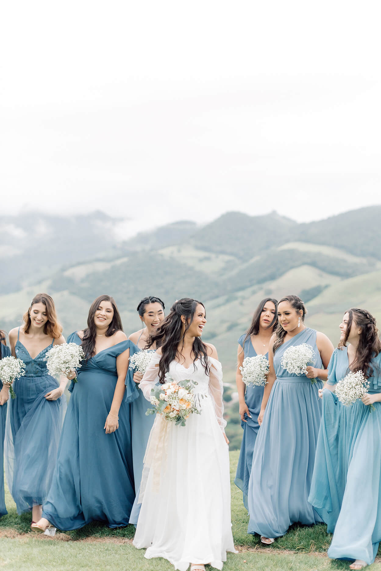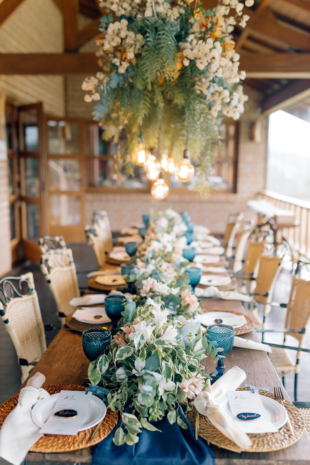 O Dusty Blue, azul marinho e tons terrosos mais claros foram escolhidos para formar a paleta de cores. Assim, as madrinhas usaram vestidos em Dusty Blue e os padrinhos foram de terno cinza com gravata azul marinho slim.