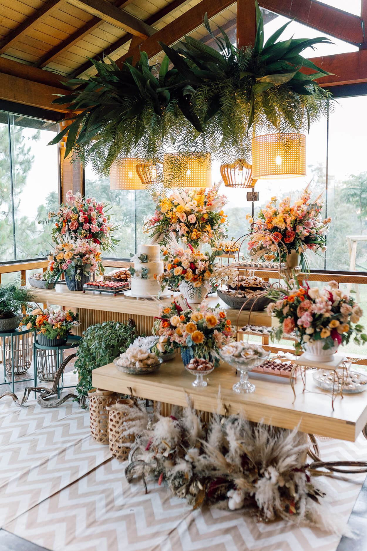 Já a decoração da cerimônia foi em tons mais claros com flores brancas, off white e folhagens e a recepção ganhou tons mais terrosos e velas.