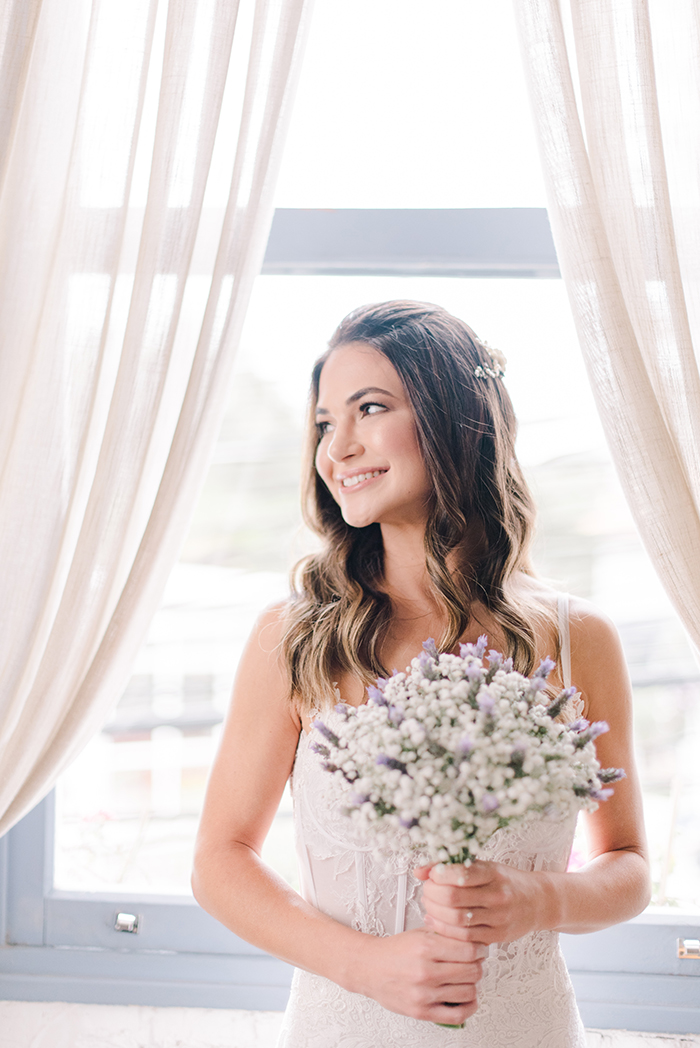 Usei um vestido com a leveza que ornou super bem com o buquê de lavandas, delicadíssimo.