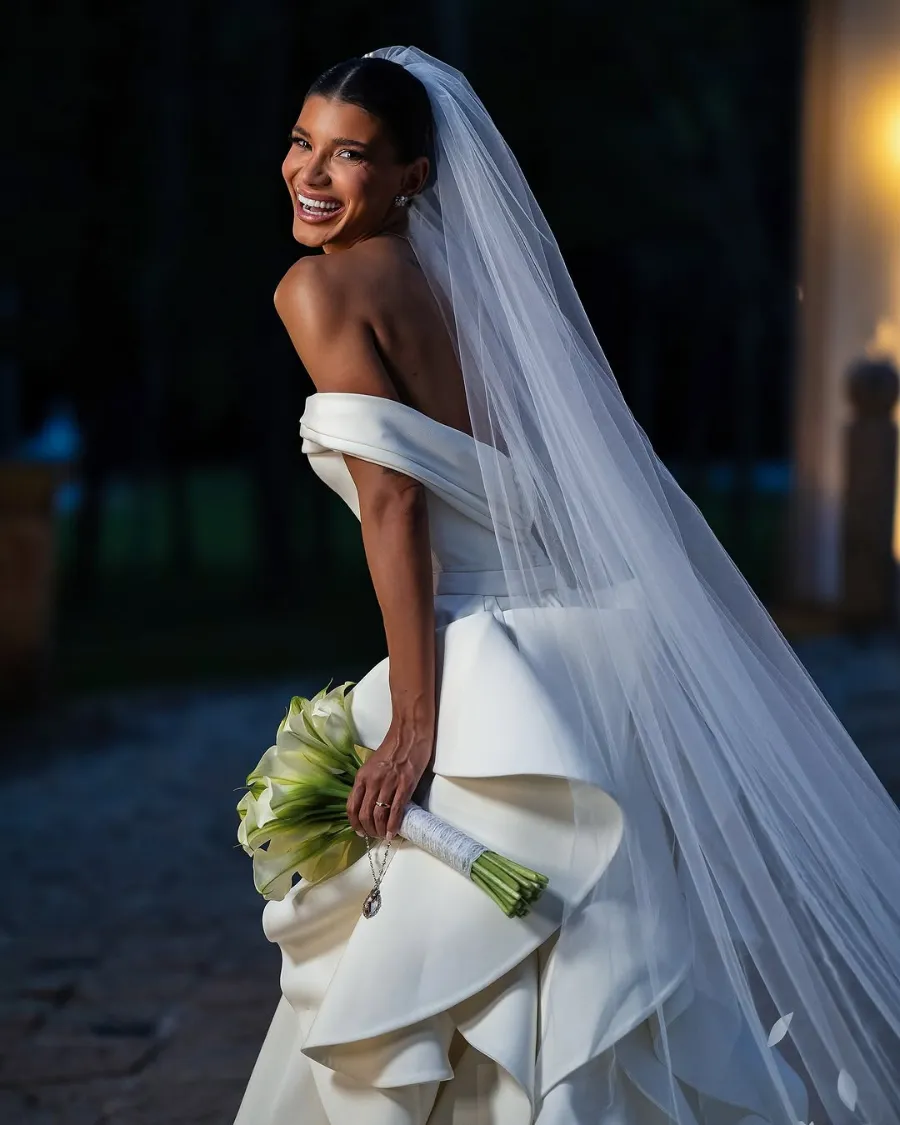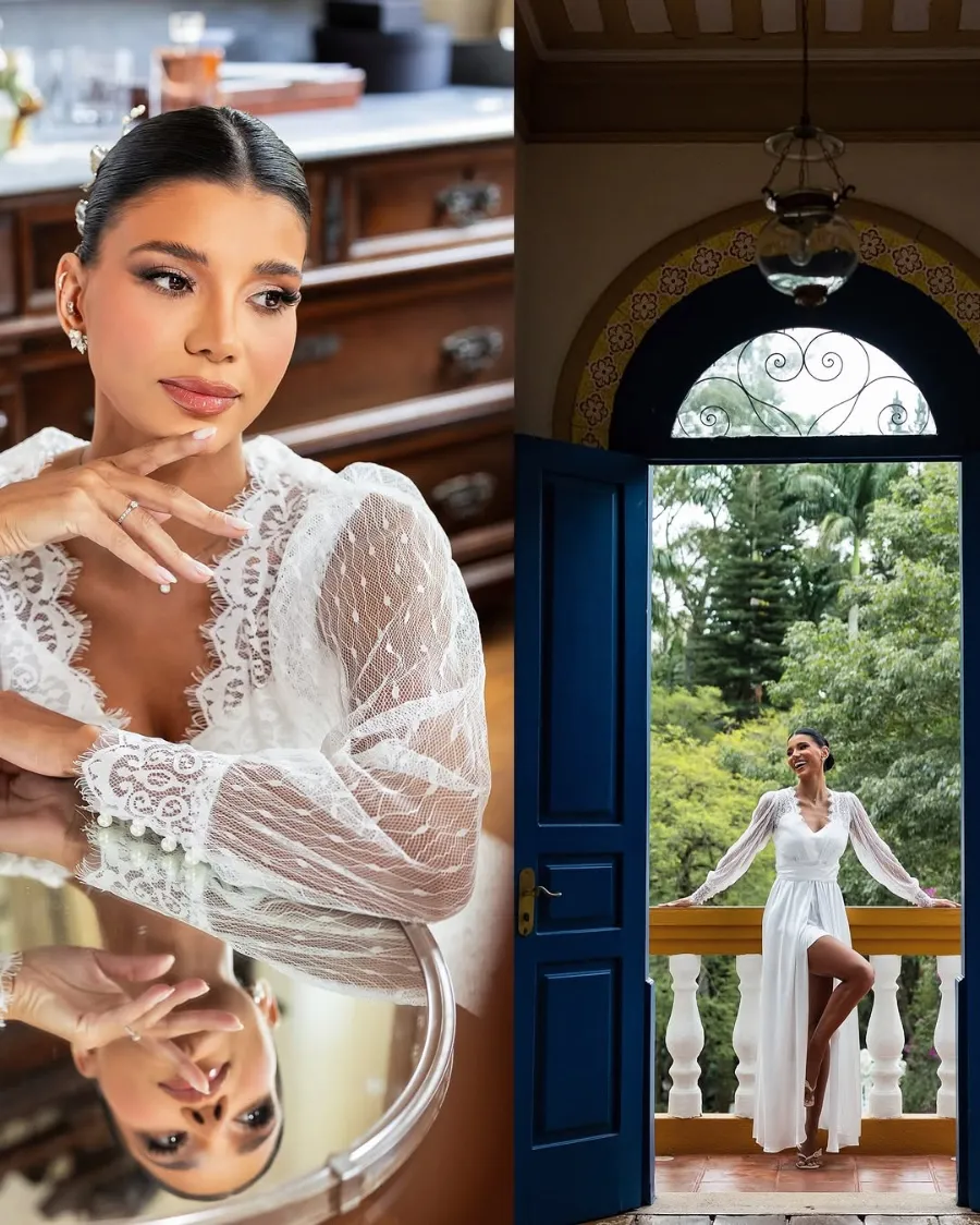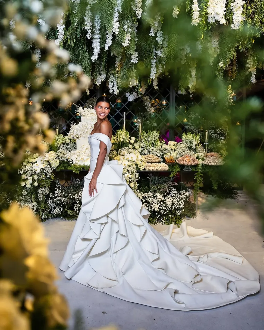 Jakelyne escolheu um vestido cheio de camadas, inspirado no que ela usou em 2023 quando foi pedida em casamento.