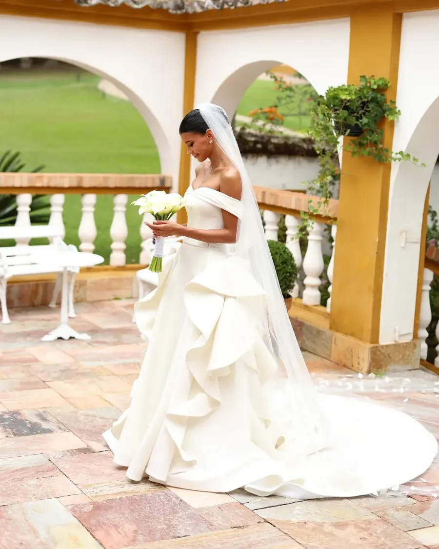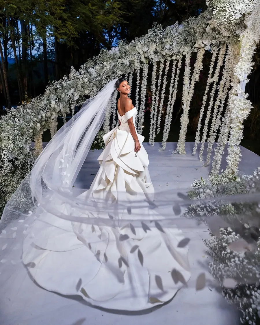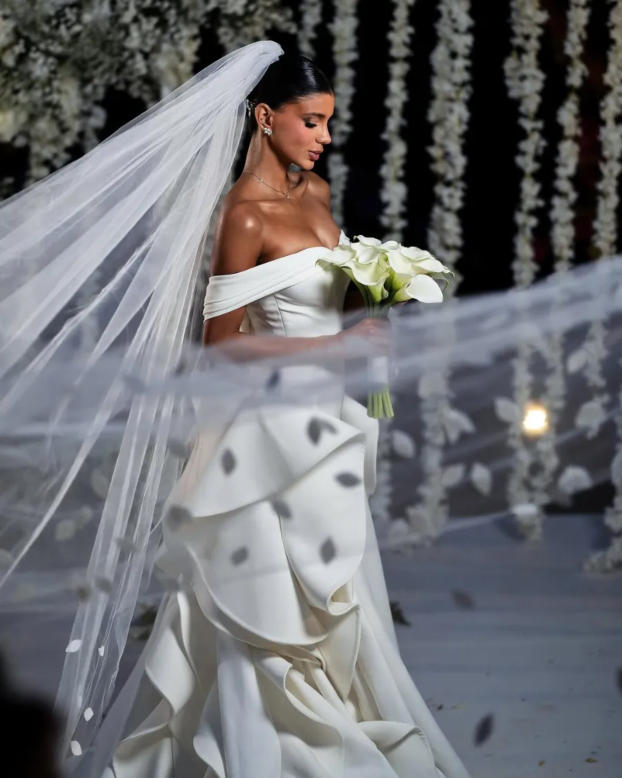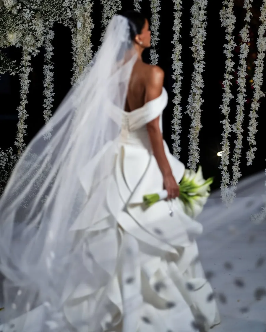 Jakelyne escolheu um vestido cheio de camadas, inspirado no que ela usou em 2023 quando foi pedida em casamento.