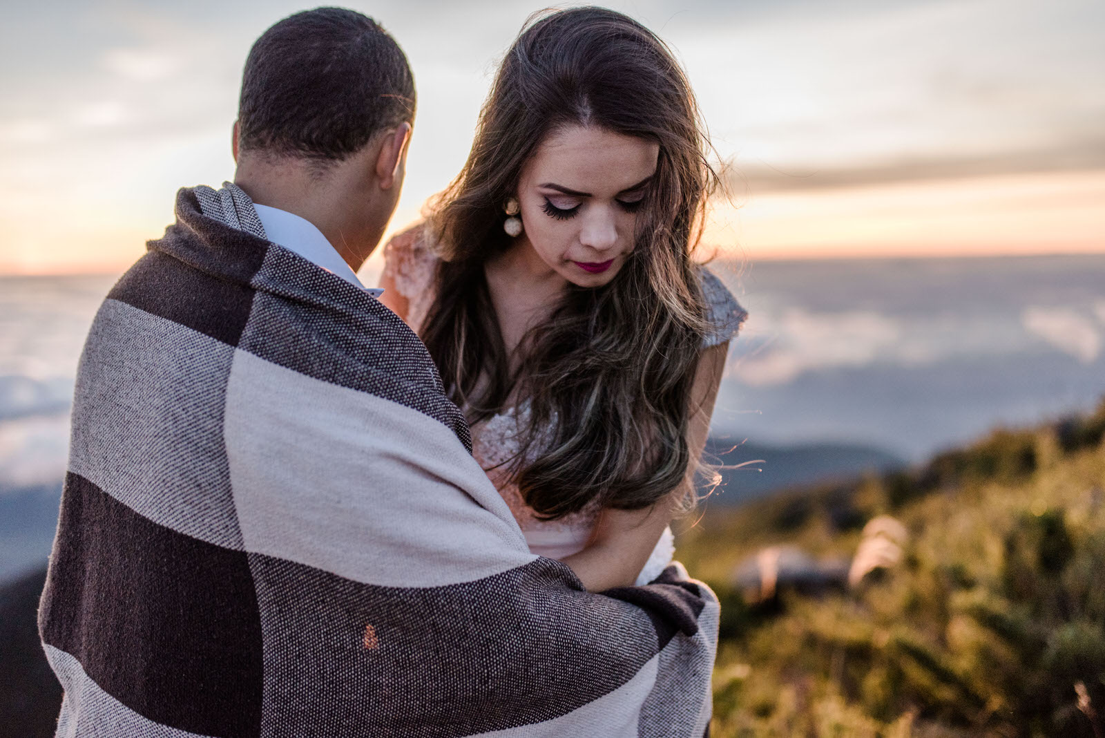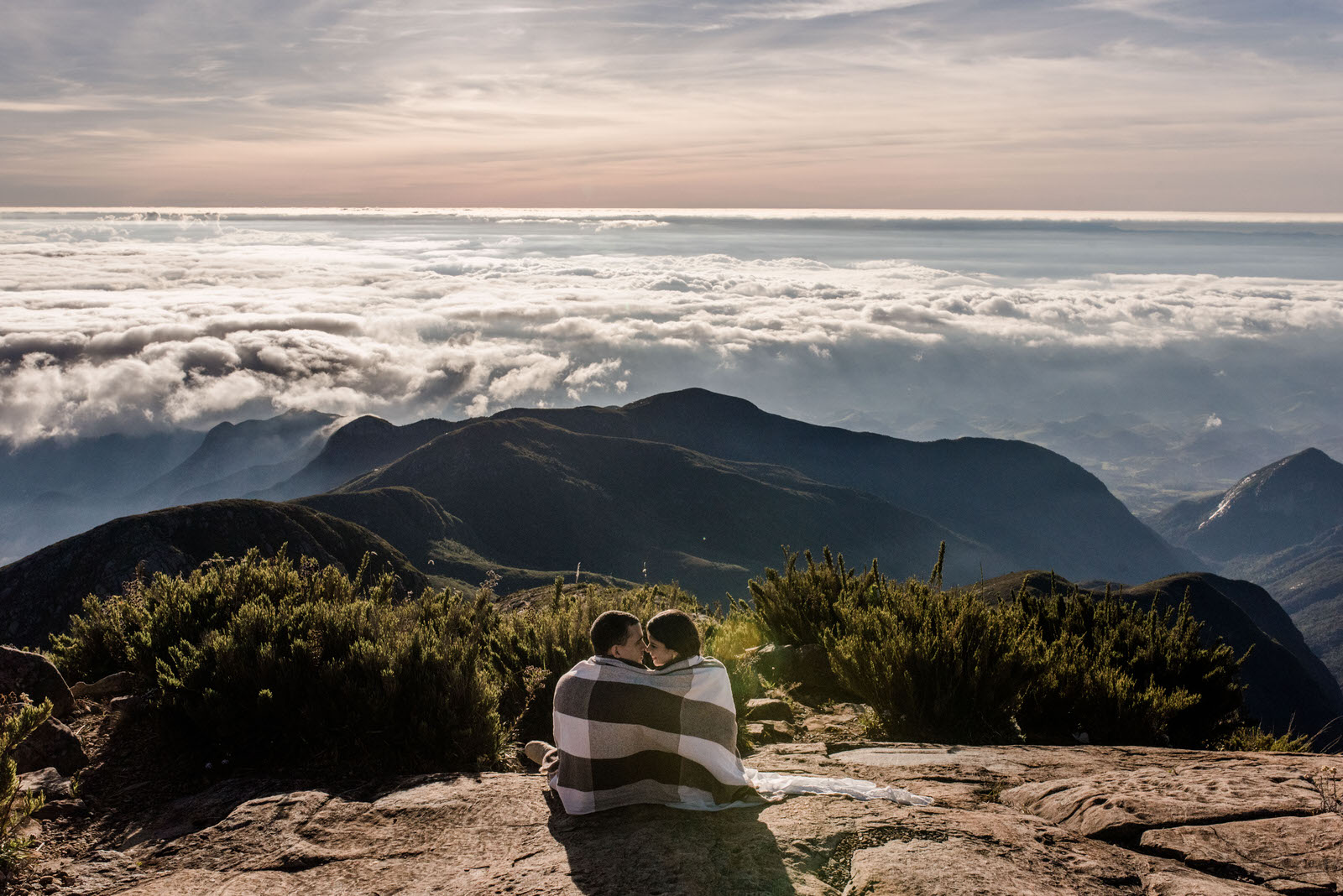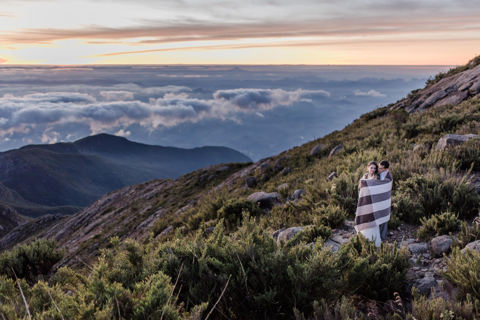 “E eu não dei opção para ele, falei que queria minhas fotos de noivado no Pico da Bandeira mas teria que ser no topo, lá no cume mesmo. Ele como me incentiva nas minhas trilhas, topou ir. Agora era necessário saber quem iria subir uma montanha para fazer as fotos, hahaha… Conseguimos a Ju, uma fotógrafa excelente que topou logo de cara subir o Pico com a gente. Marcamos com ela a melhor época para subirmos e foram necessários dois dias de fotos. Passamos um friozinho, porque subimos de noite às 21:30 e chegamos no topo às 5:30 para pegar o nascer do sol. Mass todo esforço valeu a pena, as fotos ficaram maravilhosas e principalmente: bem a nossa cara.” – Renata