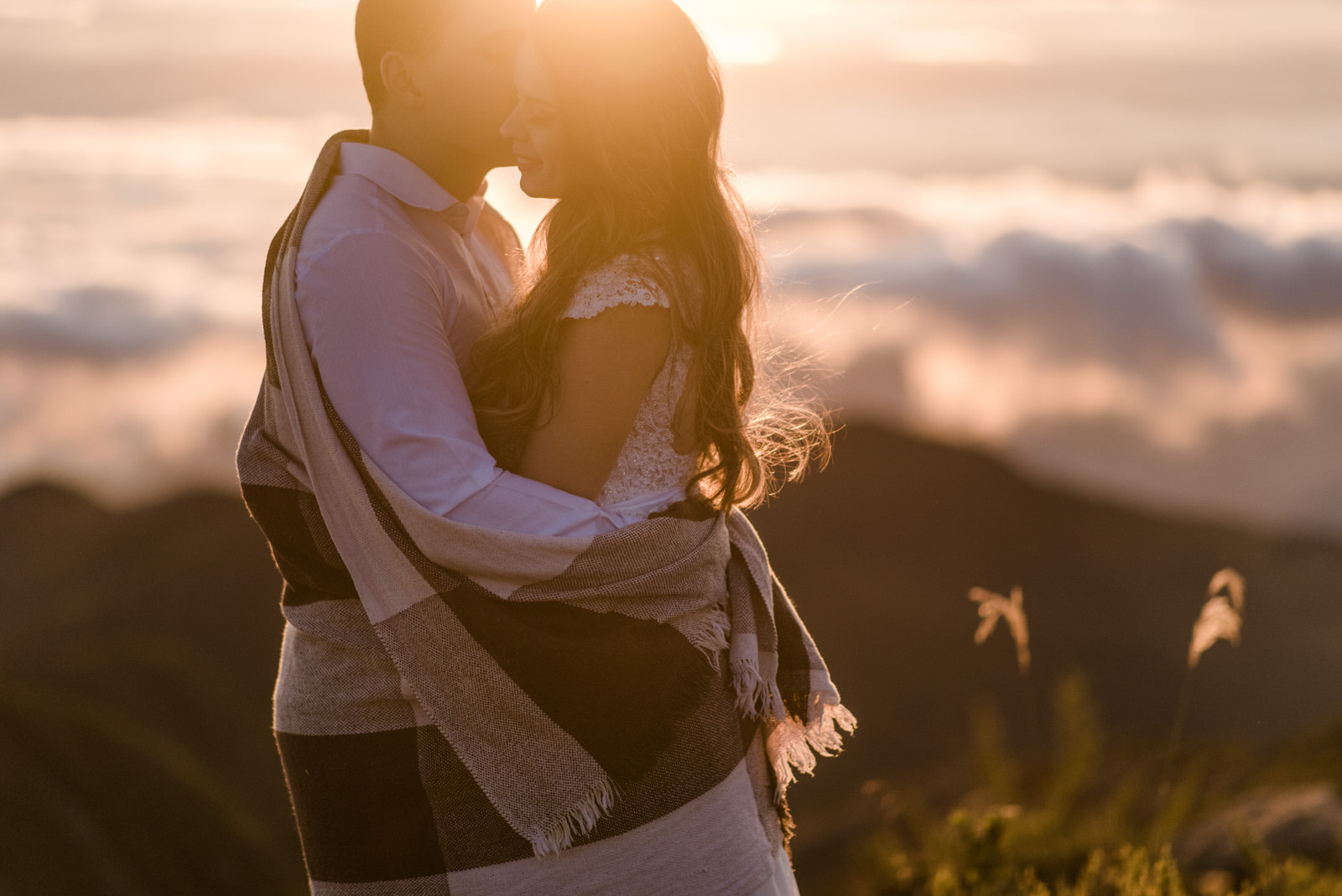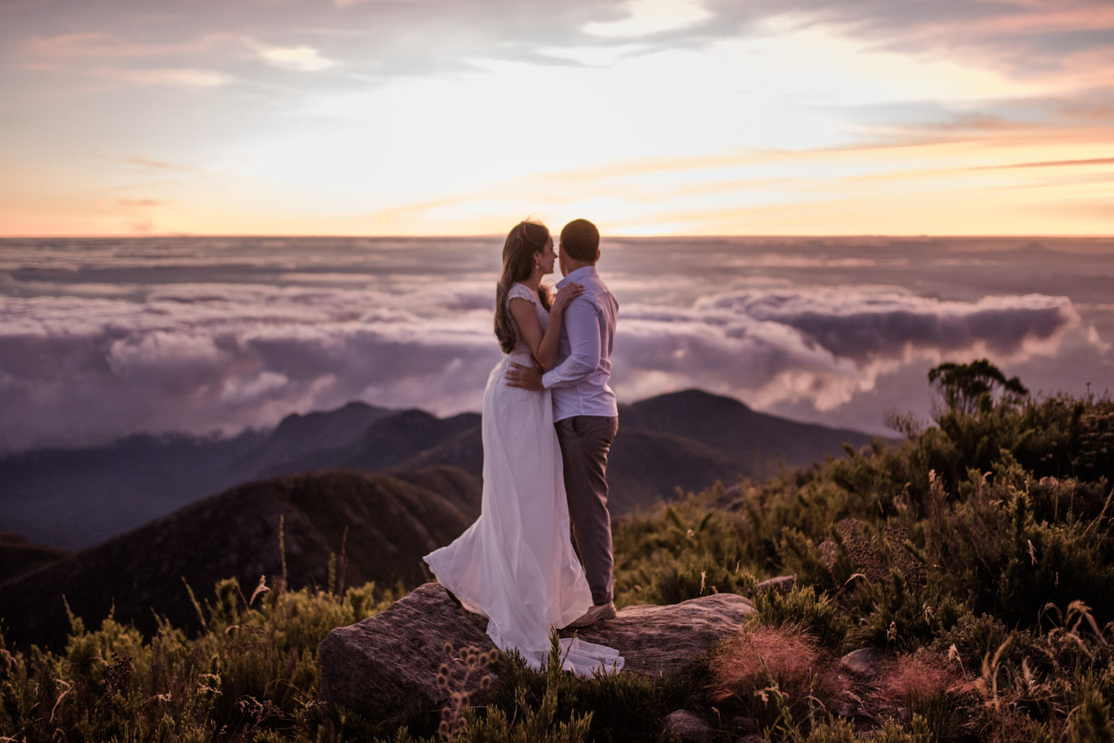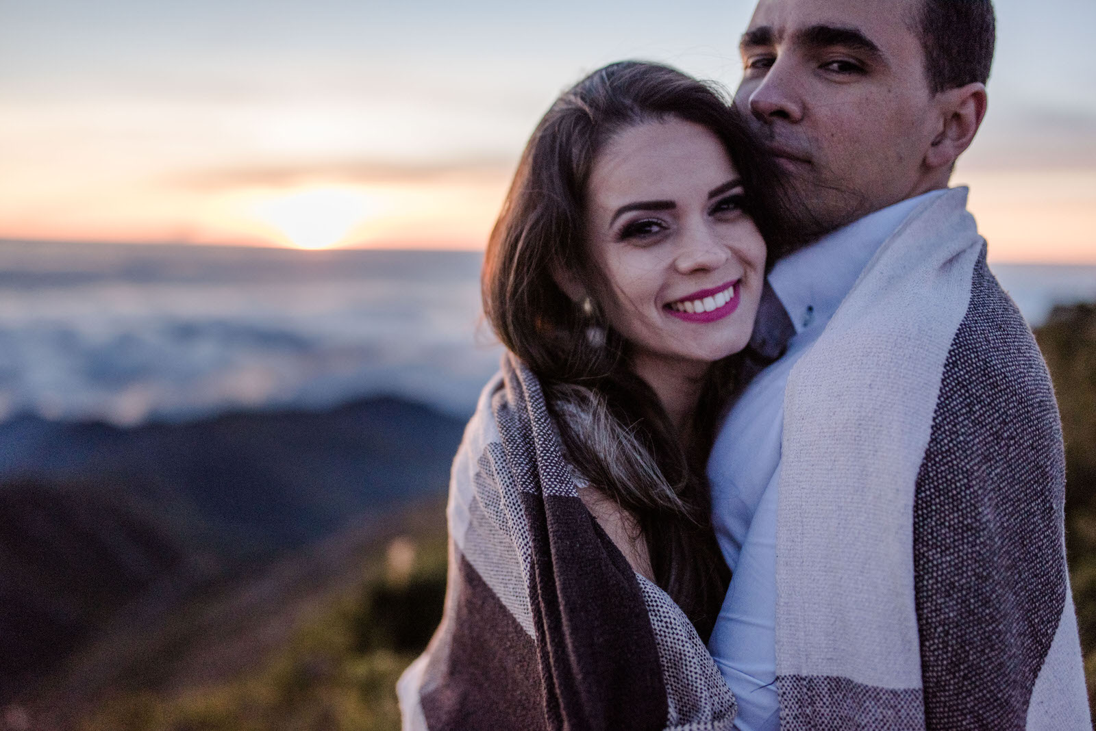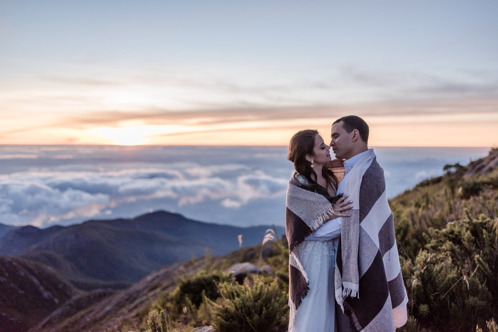 “E eu não dei opção para ele, falei que queria minhas fotos de noivado no Pico da Bandeira mas teria que ser no topo, lá no cume mesmo. Ele como me incentiva nas minhas trilhas, topou ir. Agora era necessário saber quem iria subir uma montanha para fazer as fotos, hahaha… Conseguimos a Ju, uma fotógrafa excelente que topou logo de cara subir o Pico com a gente. Marcamos com ela a melhor época para subirmos e foram necessários dois dias de fotos. Passamos um friozinho, porque subimos de noite às 21:30 e chegamos no topo às 5:30 para pegar o nascer do sol. Mass todo esforço valeu a pena, as fotos ficaram maravilhosas e principalmente: bem a nossa cara.” – Renata