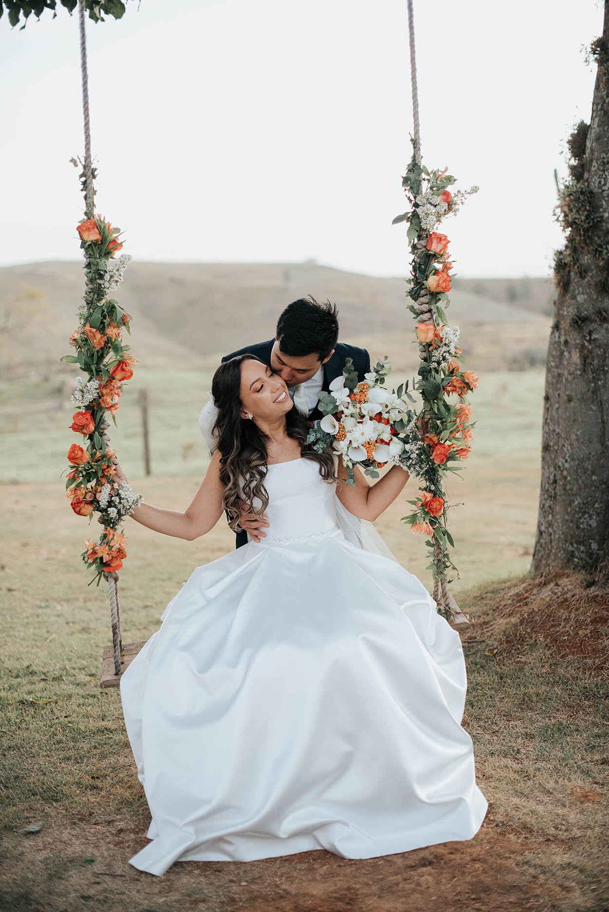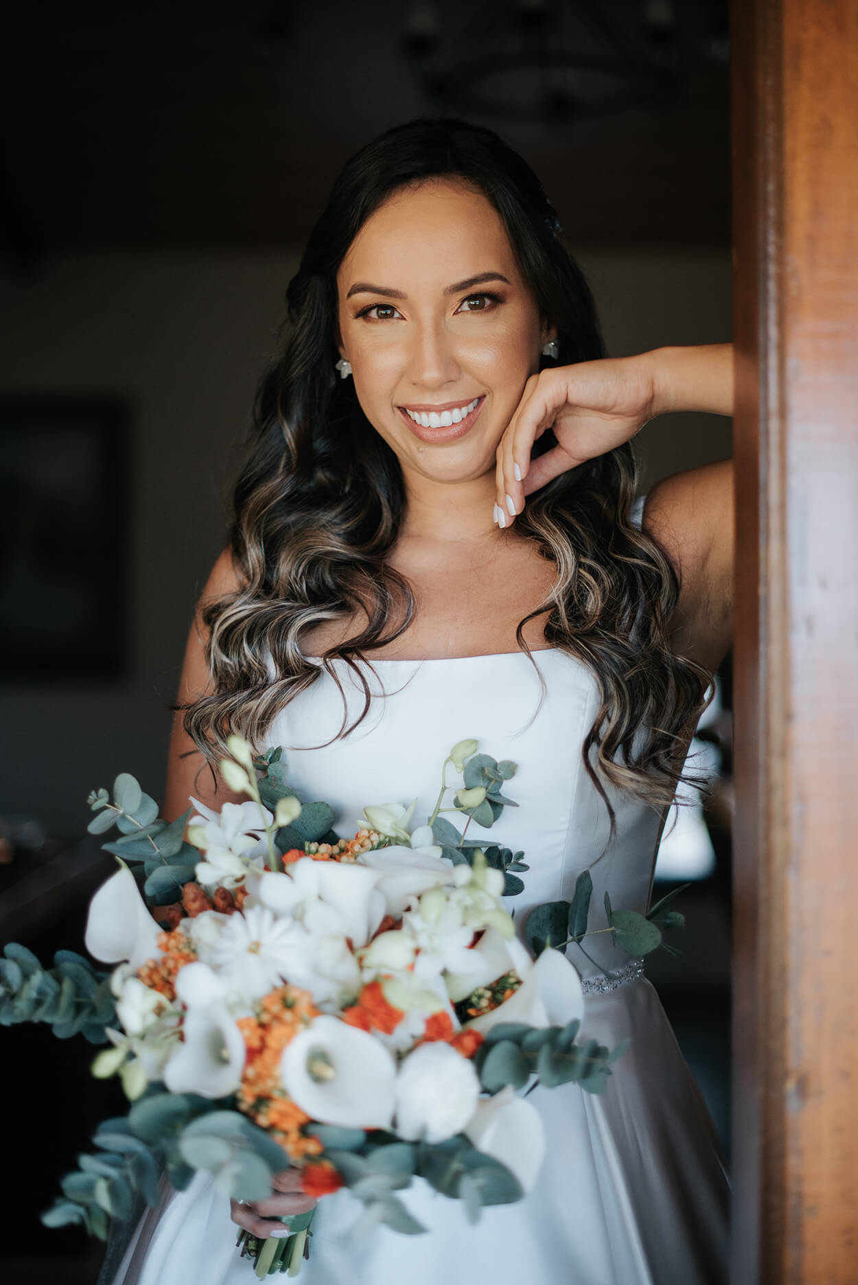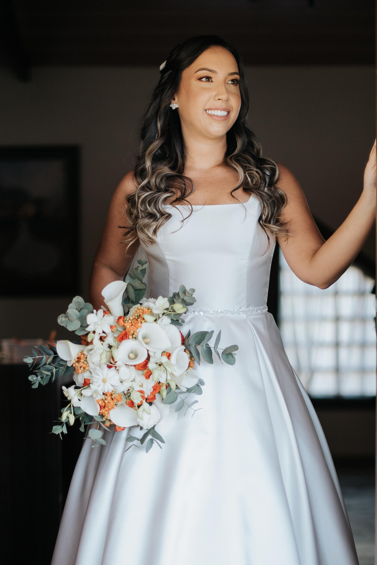 Julia sabia bem o que queria: um vestido elegante e volumoso. O decote quadrado tem um charme próprio, além disso, é uma ótima opção para noivas que desejam valorizar o colo sem abrir mão de uma boa sustentação para os seios. Por outro lado, o buquê reúne o frescor com os ramos de eucalipto, a alegria com as flores laranjas e finaliza com toda a graciosidade do copo de leite.