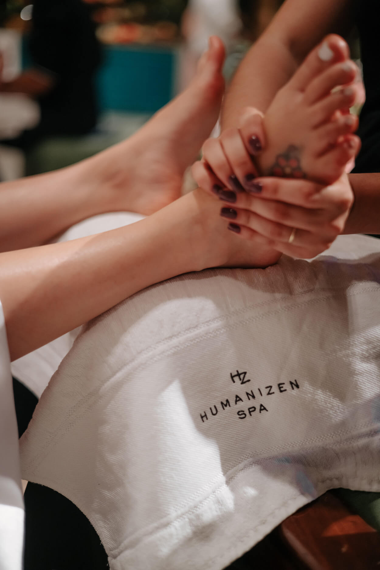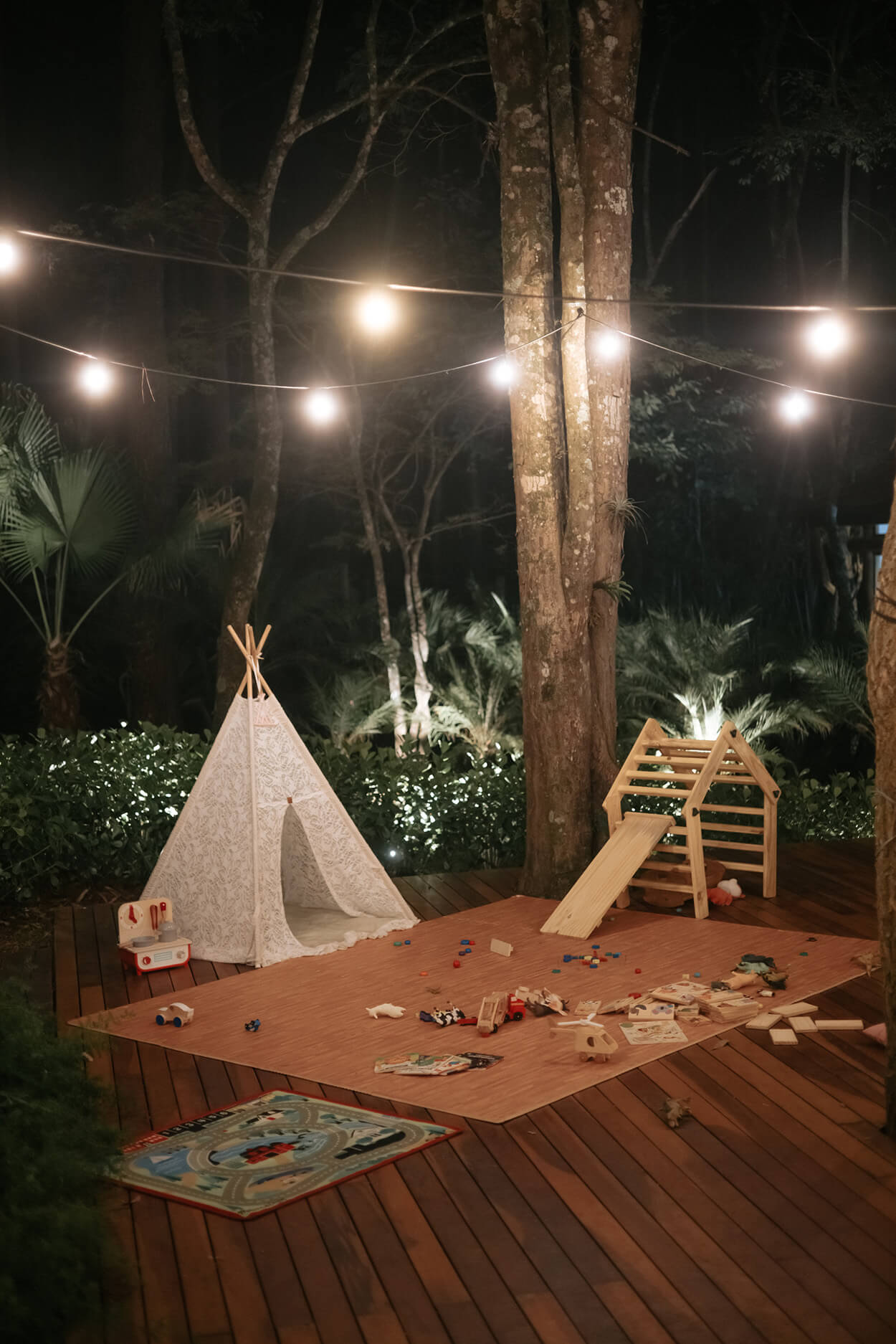 Como esse foi um evento bem família, o casal quis oferecer várias opções para cada um aproveitar do seu jeito. Spa para os pés para os adultos e um cantinho divertido para os pequenos.