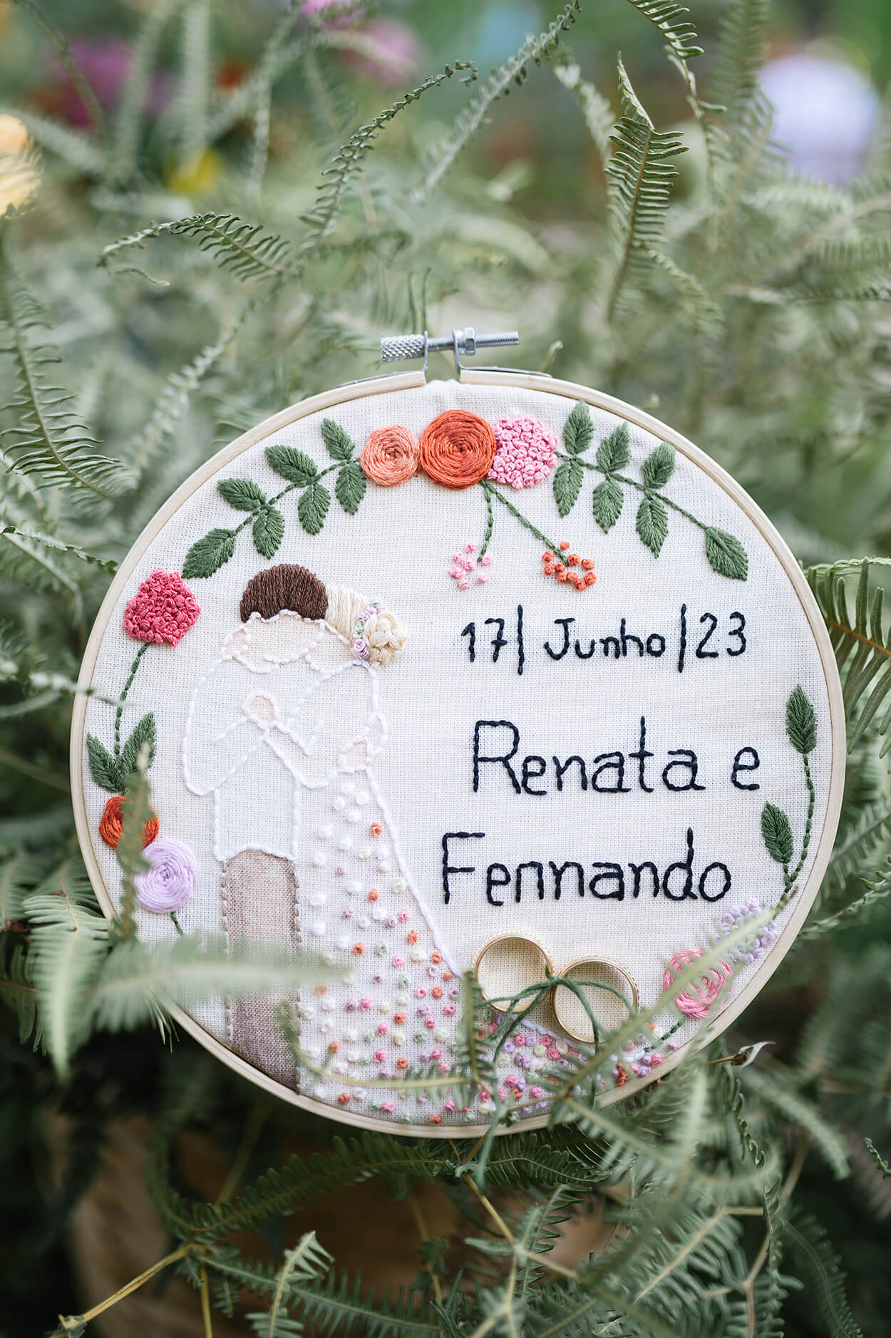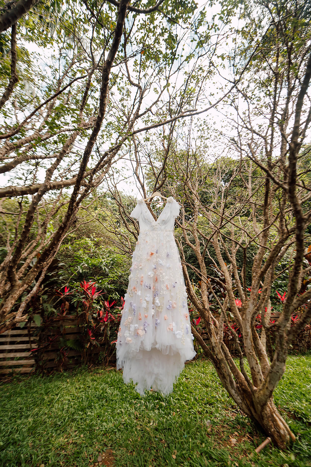 Ali foi aplicada uma renda de galhos que começavam brancos e iam ganhando cor a medida que desciam pela saia. Os tons foram escolhidos para harmonizar com a identidade visual do casamento.