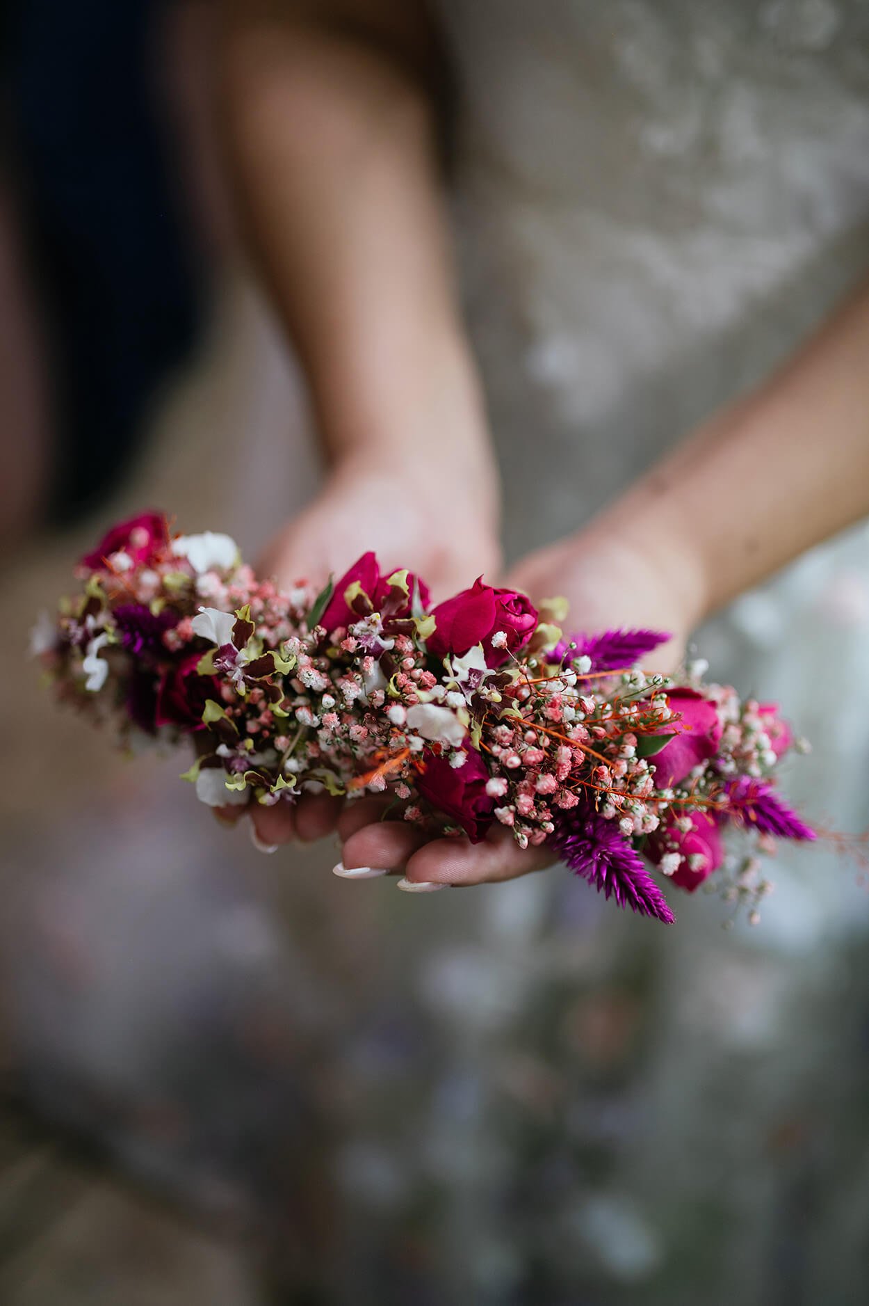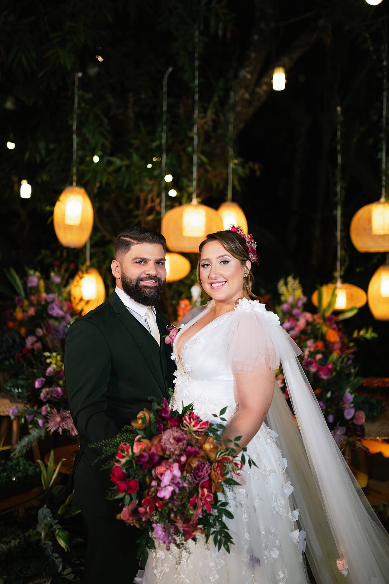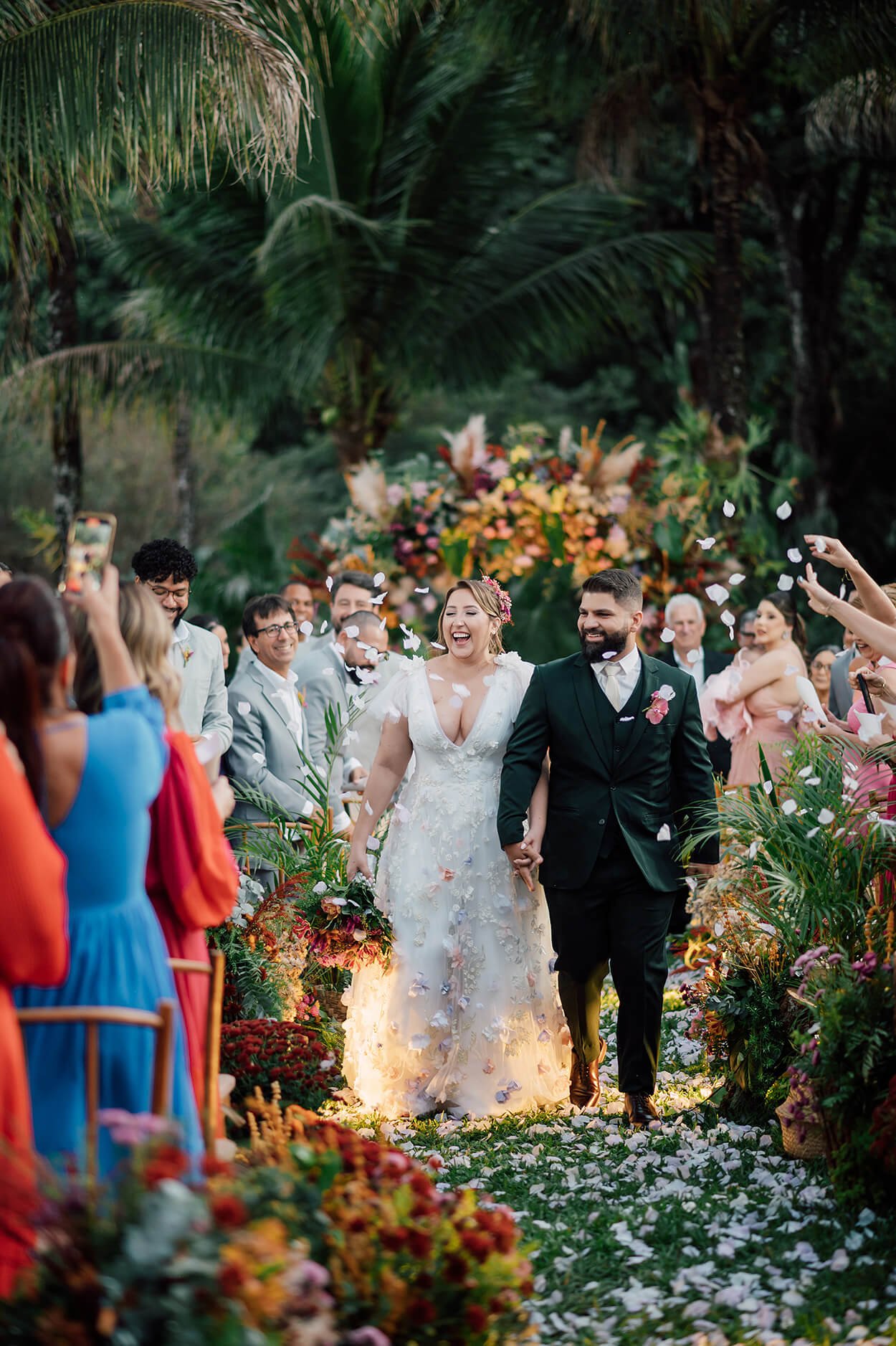 No final, 3.700 flores foram tingidas e montadas artesanalmente, costuradas à mão para criar um efeito degradê! A noiva também fez outra escolha nada tradicional: trocou o véu por uma capa coberta com flores. Que vestido maravilhoso!