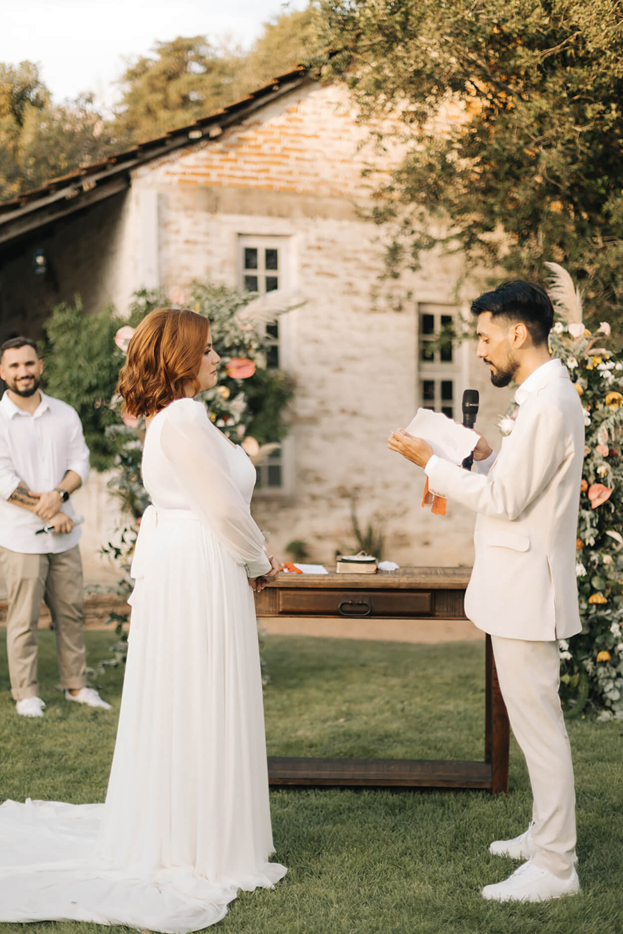 Desde o começo, os dois tinham em mente um casamento ao ar livre e durante o dia com uma pegada “menos é mais”. Dessa forma, o resultado foi uma decor boho meiga e com um ambiente acolhedor para todos.
