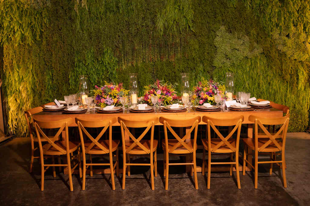 Por outro lado, a decoração na recepção usou e abusou das cores. Além disso, trouxe um mix inesperado de flores e plantas para dar vida ao cenário. Ah, e ainda tem o backdrop cheio de luzinhas charmosas!