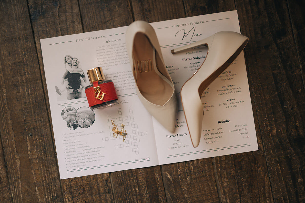 Além de romântico, o casal também é super criativo. “Nós fizemos o jornal no Canva. Para o quadro de assinaturas, comprei uma moldura, encapei o MDF com cartolina e colamos uma foto no meio (vamos trocar por uma do dia do casamento).