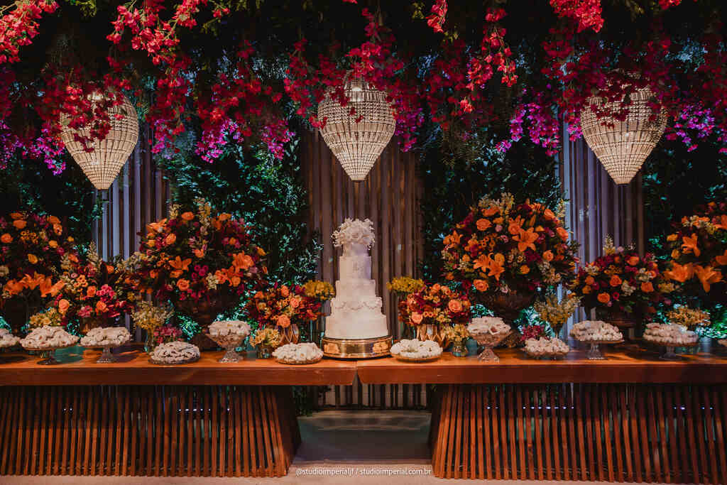 A mesa de doces com 6 metros de comprimento, ricamente decorada com um áereo de flores, 3 lustres maravilhosos e o muro inglês atrás.